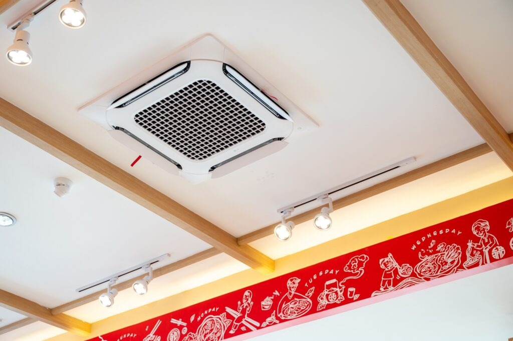 สำหรับลัคกี้ สุกี้ ติดตั้งเครื่องปรับอากาศแบบฝังฝ้าสี่ทิศทาง (4 Way Cassette) พร้อมเทคโนโลยีบานสวิงคู่ (Dual Vane) ซึ่งกระจายอากาศเย็นได้ไกลอย่างสม่ำเสมอในทุกทิศทาง มอบความเย็นสบายให้ลูกค้าทุกโต๊ะอย่างทั่วถึง พร้อมระบบฟอกอากาศในตัวที่กรองกลิ่นอาหารได้อย่างมีประสิทธิภาพ ส่วนลัคกี้ บาร์บีคิว ติดตั้งระบบ AHU (Air Handling Unit) กระจายความเย็นได้ครอบคลุมทั่วทุกพื้นที่ รองรับความร้อนสูงที่เกิดจากเตาปิ้งย่าง บาร์บีคิวได้อย่างมีประสิทธิภาพ