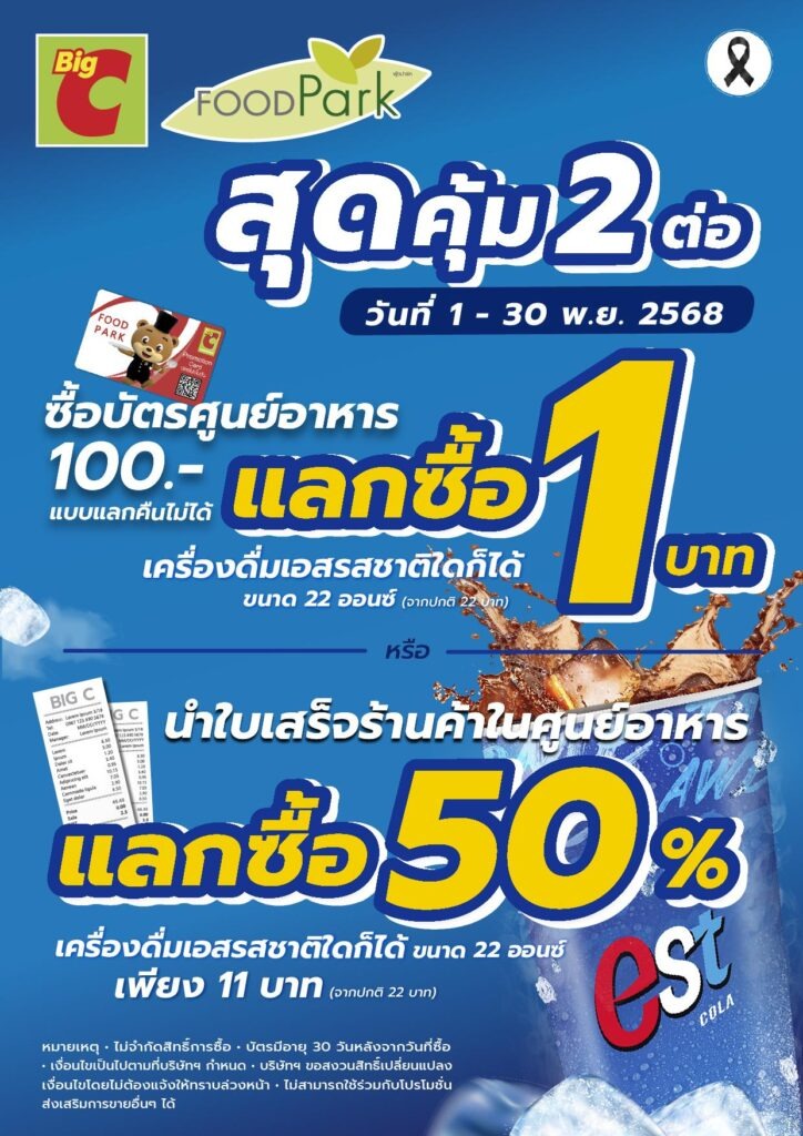 นอกจากดีลจากร้านค้าแล้ว บิ๊กซียังมอบความคุ้มค่าให้กับสายกิน กับโปรโมชั่น “สุดคุ้ม 2 ต่อ” ที่ศูนย์อาหารทั่วประเทศ เพียงซื้อบัตรศูนย์อาหารมูลค่า 100 บาท (แบบไม่แลกคืน) รับสิทธิ์แลกซื้อเครื่องดื่มเอสโคล่า 22 ออนซ์ เพียง 1 บาท หรือใช้ใบเสร็จร้านค้าในศูนย์อาหารแลกซื้อเอสโคล่าได้ในราคาเพียง 11 บาท จากราคาปกติ 22 บาท ตั้งแต่วันนี้ – 30 พฤศจิกายน 2568