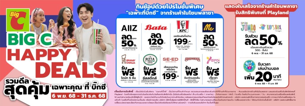 บิ๊กซี ชวนลูกค้าฉลองเทศกาลแห่งความสุขช่วงปลายปี ด้วยความสุขและความคุ้มค่า ผ่านแคมเปญ “Happy Deals รวมดีลความคุ้มส่งท้ายปีเพื่อคุณ เฉพาะที่บิ๊กซี” ที่ยกทัพโปรโมชั่นสุดพิเศษจากร้านค้าชั้นนำในโซนพลาซาและศูนย์อาหารทั่วประเทศ เพื่อให้ลูกค้าได้เพลิดเพลินกับประสบการณ์การ กิน เที่ยว ช้อป ครบจบในที่เดียว