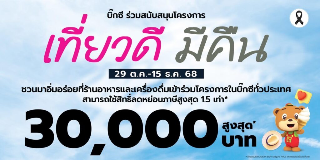 ขณะเดียวกัน ลูกค้ายังสามารถเพลิดเพลินไปกับความคุ้มค่าในโครงการภาครัฐ “เที่ยวดี มีคืน” ที่บิ๊กซีร่วมสนับสนุน เพื่อกระตุ้นการใช้จ่ายภายในประเทศ รับสิทธิลดหย่อนภาษีได้จริงสูงสุดถึง 30,000 บาท สำหรับลูกค้าที่รับประทานอาหารในร้านค้าชั้นนำที่ร่วมรายการทั่วประเทศ อาทิ MK, KFC, Swensen’s, Starbucks, The Pizza Company, Yayoi, Tim Hortons และอีกหลายร้านในศูนย์การค้าบิ๊กซี โดยลูกค้าสามารถขอรับใบกำกับภาษีเต็มรูปแบบได้ทั้งแบบ E-TAX และแบบกระดาษ เพื่อใช้สิทธิลดหย่อนภาษีได้ตามเงื่อนไขของโครงการ ตั้งแต่วันนี้ – 15 ธันวาคม 2568