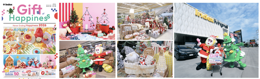 ชวนคุณเปิดโลกแห่งความสุขรับคริสต์มาส!กับ Happy pre X’mas with Jingle & Joybell สัมผัสความคิ้วต์ของMascot “Jingle” (ซานต้า) และ “Joybell” (ต้นสน) ที่รอต้อนรับพร้อมสร้างรอยยิ้มให้กับทุกคนท่ามกลางบรรยากาศ “Christmas Wonderland” ด้วยโซน Christmas Zone & Magic X’mas Ornaments รวบรวมสัญลักษณ์ของเทศกาลทั้งของใช้และของตกแต่งบ้านจากแบรนด์ Index Home เช่น ต้นคริสต์มาส รีท ลูกบอล ลูกสน ไฟประดับ รูปปั้นกวาง ถุงเท้าคริสต์มาส ไอเทมรูปขนมปังขิง ฯลฯ และโซนคริสต์มาสอิมพอร์ตจากแบรนด์ MS Natural Design เช่น ซานต้าไซน์บิ๊ก กวาง ตุ๊กตาโนม นอกจากนี้ ยังมีธีมตกแต่งพิเศษเฉพาะ 5 สาขาทั้งสาขาเกษตร–นวมินทร์ Santa Village, สาขาพัทยา Christmas Express, สาขาภูเก็ต Nature Paradise สาขาบางนา Christmas World และสาขาเชียงใหม่ Country Christmas เพื่อมอบบรรยากาศเทศกาลแห่งความสุข