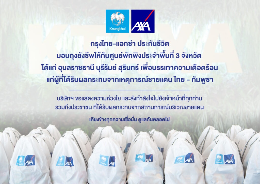 บมจ.กรุงไทย-แอกซ่า ประกันชีวิต ส่งมอบถุงยังชีพจำนวน 300 ชุด เพื่อช่วยเหลือประชาชนที่ได้รับผลกระทบจากสถานการณ์ชายแดนไทย-กัมพูชา โดยถุงยังชีพจะถูกส่งมอบให้ประชาชนผ่านศูนย์พักพิงประจำพื้นที่ 3 จังหวัด ได้แก่ จังหวัดอุบลราชธานี จังหวัดบุรีรัมย์และจังหวัดสุรินทร์ โดยทางบริษัทฯ ขอแสดงความห่วงใย และส่งกำลังใจไปยังเจ้าหน้าที่ทุกท่าน รวมถึงประชาชน ที่ได้รับผลกระทบจากสถานการณ์บริเวณชายแดน ทั้งนี้บริษัทฯ มุ่งมั่น เคียงข้างทุกความเชื่อมั่น ดูแลกันตลอดไป