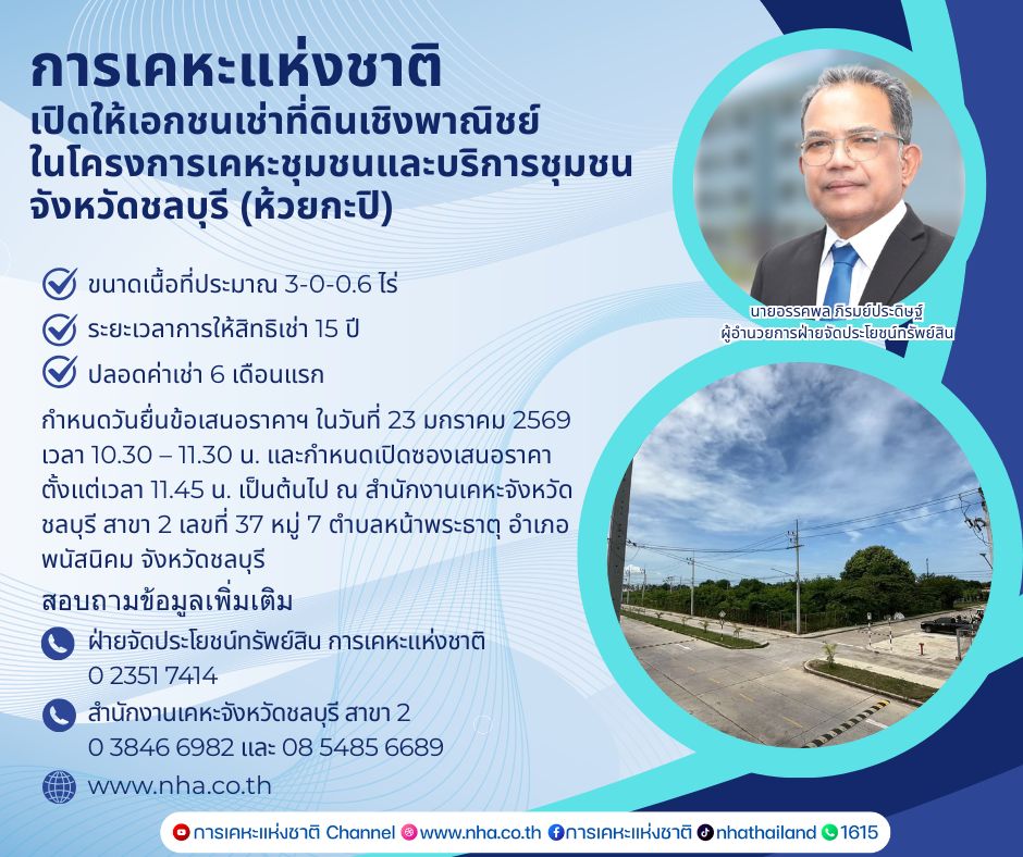 นายอรรคพล ภิรมย์ประดิษฐ์ ผู้อำนวยการฝ่ายจัดประโยชน์ทรัพย์สิน กล่าวว่า การเคหะแห่งชาติประกาศเปิดให้เอกชนยื่นข้อเสนอราคาการได้สิทธิเช่าที่ดิน เพื่อประกอบการค้าเชิงพาณิชย์ พร้อมกิจกรรมต่อเนื่อง ภายในโครงการเคหะชุมชนและบริการชุมชนจังหวัดชลบุรี (ห้วยกะปิ) โฉนดเลขที่ 2181 ขนาดเนื้อที่ประมาณ 3-0-0.6 ไร่ ตั้งอยู่บริเวณถนนซอยกระเสริม 1 ถนนสุขุมวิท ตำบลห้วยกะปิ อำเภอเมือง จังหวัดชลบุรี เพื่อให้เกิดความโปร่งใสในการดำเนินงานทุกขั้นตอนตามหลักธรรมาภิบาล การเคหะแห่งชาติจึงเปิดโอกาสให้เอกชนที่สนใจสามารถยื่นข้อเสนอราคาการได้สิทธิเช่าที่ดินดังกล่าว โดยมีอัตราค่าธรรมเนียมการได้สิทธิเช่าขั้นต่ำไม่น้อยกว่า 1,260,000 บาท ระยะเวลาการให้สิทธิเช่า 15 ปี (ทำสัญญาคราวเดียว) ในอัตราค่าเช่ารายเดือน ปีที่ 1-3 เดือนละ 54,200 บาท (ปลอดค่าเช่า 6 เดือนแรก) ปีที่ 4-6 เดือนละ 59,100 บาท ปีที่ 7-9 เดือนละ 64,500 บาท ปีที่ 10-12 เดือนละ 70,400 บาท ปีที่ 13-15 เดือนละ 76,800 บาท กำหนดหลักประกันการยื่นซองเสนอราคาจำนวน 100,000 บาท กำหนดเงินประกันการปฏิบัติตามสัญญา จำนวน 3 เท่าของค่าเช่ารายเดือนปีสุดท้าย เป็นเงิน 230,400 บาท โดยกำหนดวันยื่นข้อเสนอราคาฯ ในวันที่ 23 มกราคม 2569 เวลา 10.30 – 11.30 น. และกำหนดเปิดซองเสนอราคา ตั้งแต่เวลา 11.45 น. เป็นต้นไป ณ สำนักงานเคหะจังหวัดชลบุรี สาขา 2 เลขที่ 37 หมู่ 7 ตำบลหน้าพระธาตุ อำเภอพนัสนิคม จังหวัดชลบุรี