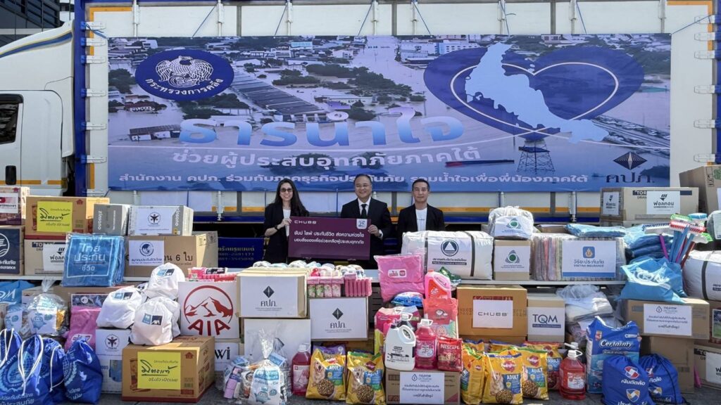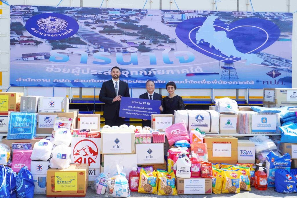 คุณนิตยา พิริยะธรรมวงศ์ (ขวา) ประธานกรรมการบริหาร และ คุณเนลสัน เติร์ก (ซ้าย) หัวหน้าสายงานประกันภัยทรัพย์สิน และประกันภัยความรับผิด ร่วมช่วยเหลือผู้ประสบอุทกภัยในพื้นที่ภาคใต้ โดยส่งมอบสิ่งของจำเป็นผ่านสำนักงานคณะกรรมการกำกับและส่งเสริมการประกอบธุรกิจประกันภัย (คปภ.) นำโดย คุณชูฉัตร ประมูลผล (กลาง) เลขาธิการ