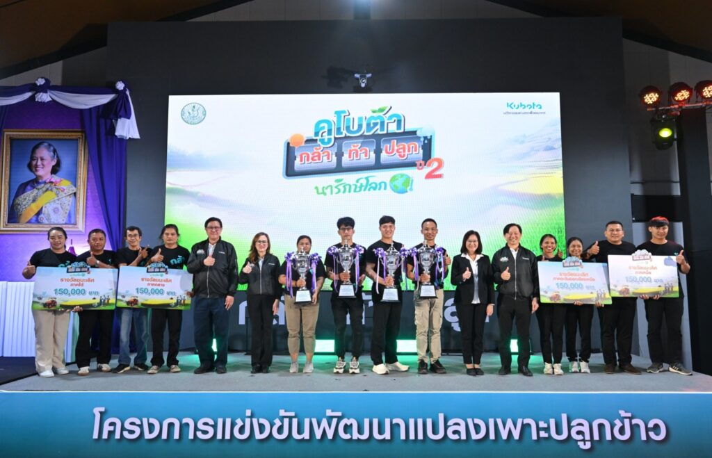 ซึ่งในปีนี้ สยามคูโบต้าและกรมส่งเสริมการเกษตร ได้จัดโครงการ “คูโบต้า กล้า ท้า ปลูก” ปี 2 ตอน นารักษ์โลก เพื่อต่อยอดความสำเร็จจากปีที่ผ่านมา โดยขยายผลสู่การปลูกข้าวรูปแบบทีมเพื่อสร้างเครือข่าย Smart Farmer ทั่วประเทศใน 4 ภูมิภาคของไทย ได้แก่ ภาคเหนือ ภาคตะวันออกเฉียงเหนือ ภาคกลาง และภาคใต้ เราได้เฟ้นหาผู้ชนะ โดยพิจารณาถึงการลงข้อมูลบันทึกปฏิทินการเพาะปลูก การนำเสนอและจัดทำแผนธุรกิจ การนำองค์ความรู้ด้านการทำนารักษ์โลก หรือการทำนาลดโลกร้อน ซึ่งเป็นการทำเกษตรคาร์บอนต่ำด้วยการทำนาเปียกสลับแห้งเพื่อลดการปล่อยก๊าซมีเทนจากน้ำขังในนาไปปรับใช้ รวมถึงประสิทธิภาพในการผลิตข้าว ตลอดจนการให้ความร่วมมือและการมีส่วนร่วมของทีม จนได้ผู้ชนะ 4 ทีมจาก 4 ภาคทั่วประเทศ นอกจากนี้ยังได้รับพระมหากรุณาธิคุณจากสมเด็จพระกนิษฐาธิราชเจ้า กรมสมเด็จพระเทพรัตนราชสุดาฯ สยามบรมราชกุมารี พระราชทานถ้วยรางวัลแก่ผู้ชนะในครั้งนี้ สยามคูโบต้าขอแสดงความยินดีและหวังเป็นอย่างยิ่งว่า โครงการนี้จะเป็นการส่งเสริมให้เกษตรกรได้เห็นความสำคัญของการใช้เครื่องมือจดบันทึกการเพาะปลูก ตลอดจนการทำนาแบบรักษ์โลก ความสำเร็จนี้ไม่ใช่เพียงความสำเร็จของแต่ละทีม แต่ยังเป็นสัญลักษณ์ของความหวังและพลังใหม่ ๆ ของ Young Smart Farmer ที่จะเป็นกำลังสำคัญในการพัฒนาภาคการเกษตรไทยต่อไป