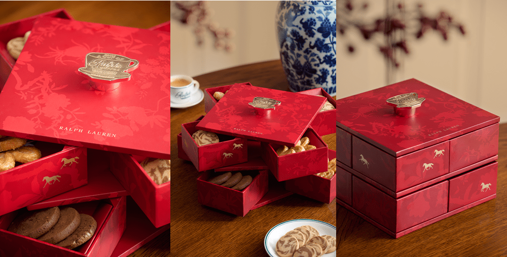 กล่องของขวัญโดดเด่นด้วยดีไซน์สีแดงสดใส ประดับด้วยลวดลายดอกไม้ที่ได้รับแรงบันดาลใจมาจากโรงน้ำชา มีดอกโบตั๋น สัญลักษณ์แห่งความเจริญรุ่งเรืองเป็นจุดเด่น ตกแต่งด้วยลวดลายม้าสีทองต้อนรับปีมะเมีย ความพิเศษอยู่ที่หูจับสีทองดีไซน์รูปถ้วยกาแฟ Ralph’s Coffee ที่พร้อมมอบประสบการณ์อันน่าประทับใจให้แก่ผู้ได้รับ เพียงหมุนหูจับจะพบกับลิ้นชัก 8 ช่องอยู่ภายใน ชวนให้นึกถึงเสน่ห์ของกล่องลูกกวาดจีนแบบดั้งเดิม และพร้อมให้ทุกคนมาร่วมแบ่งปันความสุขและการเฉลิมฉลองร่วมกัน