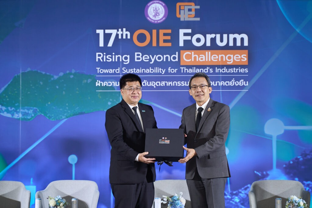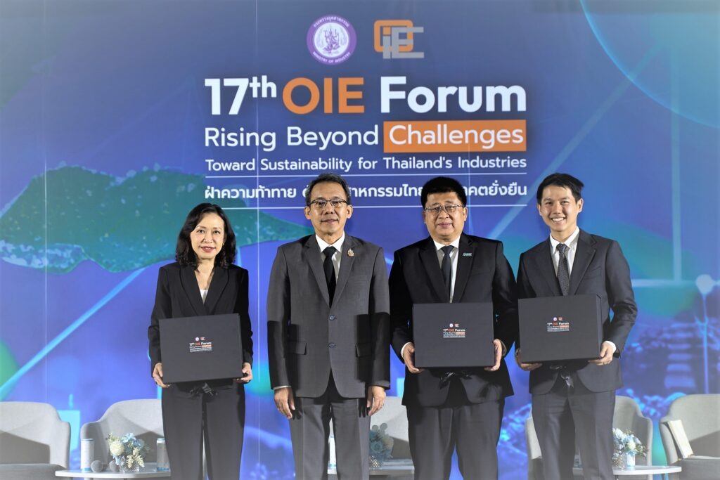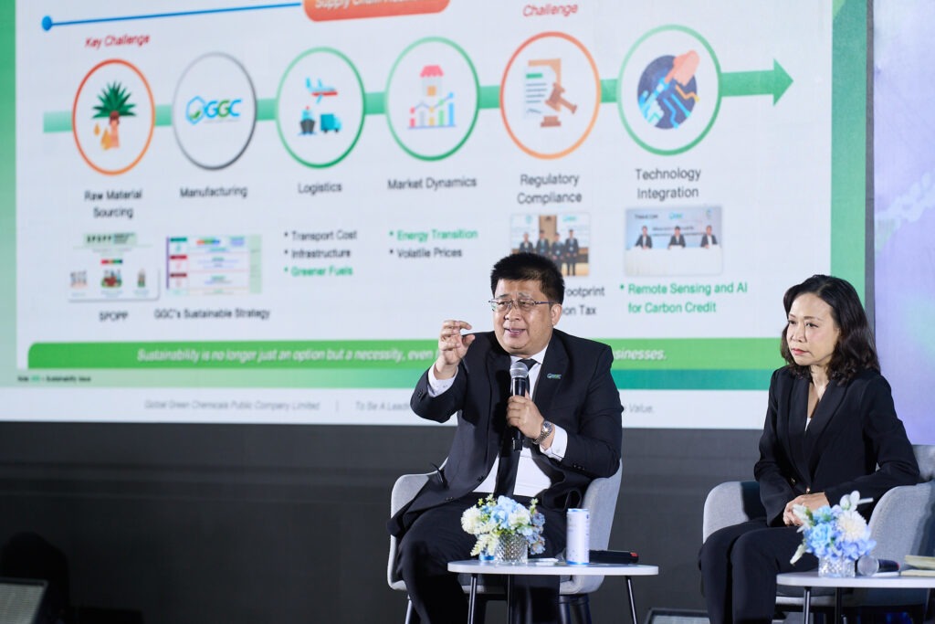 นายกฤษฎา ประเสริฐสุโข (ที่ 2 จากขวา) กรรมการผู้จัดการ บริษัท โกลบอลกรีนเคมิคอล จำกัด (มหาชน) หรือ GGC ร่วมบรรยายพิเศษกับวิทยากรระดับชั้นนำในหัวข้อ “ฝ่าความท้าทาย ดันอุตสาหกรรมไทยสู่อนาคตยั่งยืน” ภายในงาน OIE Forum ครั้งที่ 17 ภายใต้แนวคิด “Rising Beyond Challenges : Toward Sustainability for Thailand’s Industries ซึ่งจัดโดยสำนักงานเศรษฐกิจอุตสาหกรรม (สศอ.) พร้อมโชว์บทบาทความเป็นผู้นำในอุตสาหกรรมปาล์มไทย รุกแผนสร้างมูลค่าเพิ่มจาก “น้ำมันปาล์ม” สู่ Oleochemicals High Value Products ป้อนตลาดเครื่องสำอางและสุขภาพระดับโลก พร้อมเปิดตัวการนำนวัตกรรมเทคโนโลยีดาวเทียมและ AI ติดตามการกักเก็บคาร์บอน ยกระดับสวนปาล์มไทยสู่ “Low Carbon Supply Chain” แห่งแรกในอาเซียน ณ ศูนย์การประชุมแห่งชาติสิริกิติ์.