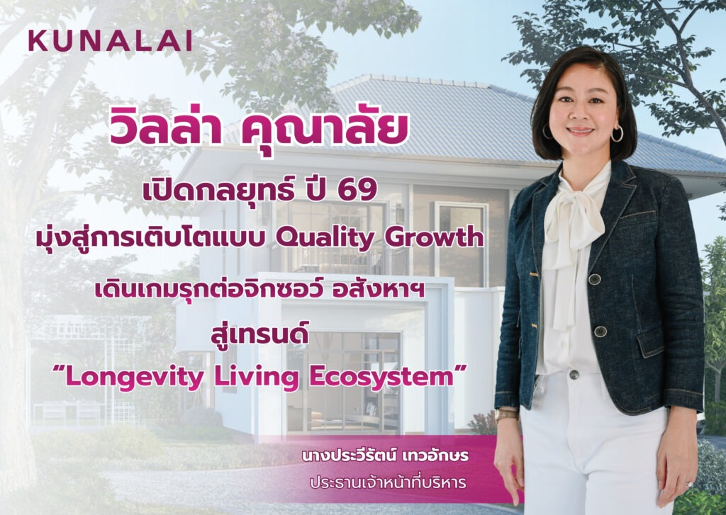 บมจ.วิลล่า คุณาลัย (KUN) เดินหน้าปรับกลยุทธ์ ปี2569 เน้นการเติบโตอย่างมีคุณภาพ “Quality Growth” ต่อจิกซอว์ อสังหาฯ สู่เทรนด์ “Longevity Living Ecosystem”ปักหมุดโซนพระราม2-บางขุนเทียน ตอบโจทย์การออกแบบ “ระบบการอยู่อาศัยเพื่ออายุวัฒน์” พร้อมขับเคลื่อนสร้างการรับรู้แบรนด์” คุณาลัย” ทั้ง 4 ทิศ อย่างต่อเนื่อง ตั้งเป้ายอดขาย (Presales) ปีนี้ 1,200 ล้านบาท และรายได้รวม 600 ล้านบาท มุ่งสู่การเป็นผู้พัฒนาเมืองที่อยู่อาศัยแนวราบขนาดใหญ่ในโซนชานเมืองศักยภาพของกรุงเทพฯ–ปริมณฑล ภายใต้แนวคิดการเติบโตอย่างมีคุณภาพ
