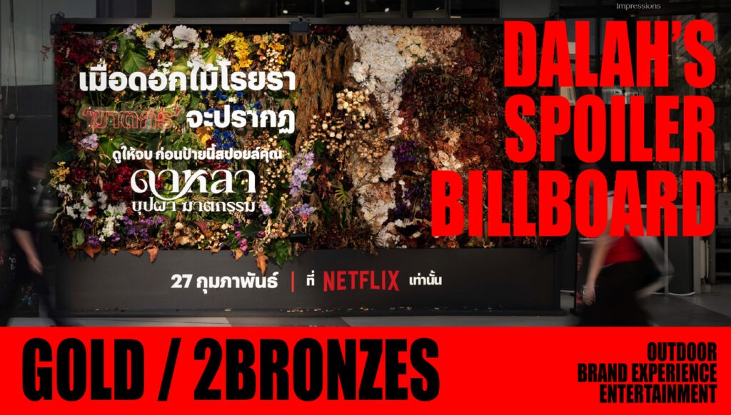 นอกจากนี้ VML Thailand ยังคว้ารางวัล 1 Gold และ 2 Bronze Spikes จากแคมเปญ “Dalah’s Spoiler Billboard” ที่สร้างสรรค์ขึ้นเพื่อสื่อสารประชาสัมพันธ์ให้กับ Netflix โดยได้แรงบันดาลใจจากความวิตกกังวลทางวัฒนธรรมเกี่ยวกับการถูกสปอยล์เนื้อเรื่องของซีรีส์ไทยเรื่อง “ดาหลา บุปผา ฆาตกรรม” มาร่วมคิดค้นและผ่านการสร้างสรรค์แนวใหม่ โดยเปลี่ยนป้ายโฆษณาให้กลายเป็นผลงานศิลปะที่มีชีวิต ที่ถูกปกคลุมด้วยกิ่งไม้ ดอกไม้ และหนามจริงๆ ซึ่งจะค่อยๆ เผยเนื้อเรื่องออกมาเมื่อหนามเหล่านั้นเติบโตและเบ่งบานขึ้น ทำให้แคมเปญนี้เกิดความโดดเด่นและน่าค้นหาความหมายมากขึ้น จนกลายเป็นปรากฏการณ์สำคัญที่ดึงดูดความสนใจ เชิญชวนผู้คน และจุดกระแสการพูดถึงเป็นวงกว้างมากขึ้น ส่งผลให้แคมเปญนี้ได้รับรางวัล Gold สาขา Outdoor และ Bronze สาขา Brand Experience & Entertainment