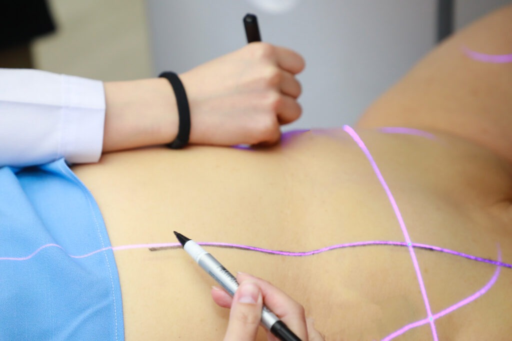 รศ.พญ.กิตต์วดี ศักดิ์ศรชัย แพทย์ผู้เชี่ยวชาญด้านการฉายรังสีมะเร็งเต้านม หน่วยรังสีรักษาและมะเร็งวิทยา อธิบายว่า การรักษาด้วยการฉายรังสีแบบเดิม จำเป็นต้องขีดเส้นหมึกถาวรบนผิวหนังเพื่อระบุตำแหน่ง ซึ่งส่งผลกระทบทั้งด้านจิตใจและการใช้ชีวิตประจำวัน ผู้ป่วยหลายรายกังวลเรื่องรูปลักษณ์ กลัวเส้นเลือน ไม่กล้าอาบน้ำตามปกติ หรือมีปัญหาแพ้น้ำหมึก