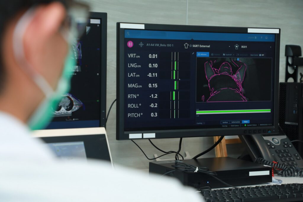 คุณพันทิวา อุณห์ศิริ นักรังสีการแพทย์ผู้ทรงคุณวุฒิ ปฏิบัติงานด้านฟิสิกส์การแพทย์ อธิบายว่า SGRT ทำงานภายใต้ระบบภาพนำวิถี (Image-guided radiotherapy: IGRT) โดยใช้ลำแสงสร้างภาพผิวหนังผู้ป่วยแบบ 3 มิติเรียลไทม์ โดยไม่เพิ่มปริมาณรังสีให้ผู้ป่วย ระบบสามารถเปรียบเทียบตำแหน่งผู้ป่วยกับภาพอ้างอิงได้ตลอดเวลา ติดตามการหายใจและหยุดฉายรังสีอัตโนมัติทันทีเมื่อพบการเคลื่อนไหวเกินค่าที่กำหนด ก่อนการรักษายังมีการเอกซเรย์ตรวจยืนยันตำแหน่งซ้ำ เพื่อความมั่นใจและความปลอดภัยสูงสุด