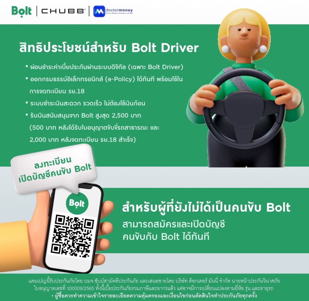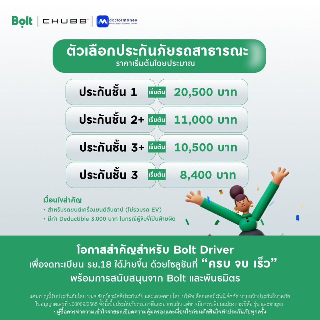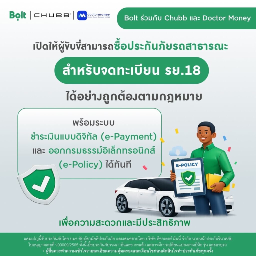 โบลท์ (Bolt) ประเทศไทย ร่วมกับสมาคมธุรกิจเช่าซื้อไทย บริษัท ชับบ์สามัคคีประกันภัย จำกัด (มหาชน) และบริษัท ด๊อกเตอร์ มันนี่ จำกัด (Doctor Money) ประกาศความร่วมมือครั้งสำคัญ ภายใต้ “โครงการความร่วมมือด้านประกันภัย เพื่อสนับสนุนการจดทะเบียนรถยนต์สาธารณะ รย.18” โดยมีเป้าหมายเพื่อช่วยลดภาระต้นทุน และเพิ่มโอกาสให้ผู้ขับขี่สามารถเข้าสู่ระบบได้อย่างถูกต้อง สอดคล้องกับทิศทางการกำกับดูแลอุตสาหกรรม ride-hailing ของประเทศไทยที่กำลังก้าวเข้าสู่ช่วงการบังคับใช้กฎระเบียบอย่างเต็มรูปแบบ