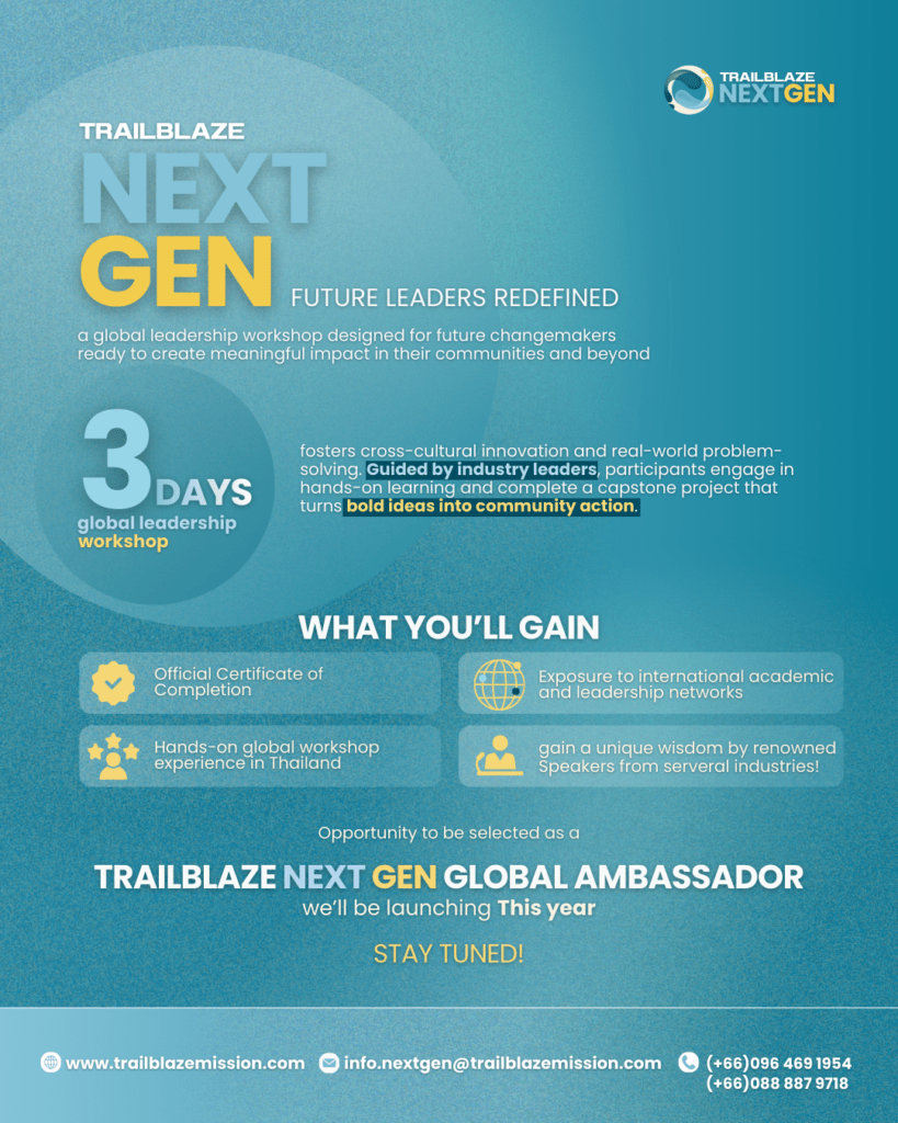 Trailblaze Next Gen เทรลเบลซ์ เน็กซ์เจน ถือเป็นอีกหนึ่งความตั้งใจของคนไทยที่จะสร้างการเปลี่ยนแปลงในระดับนานาชาติ สุดท้ายนี้ทาง เทรลเบลซ์ อะคาเดมี ภายใต้ เทรลเบลซ์ มิสชั่น ขอเชิญชวนเยาวชนคนรุ่นใหม่ทั้งในไทยและต่างประเทศมาร่วมทำเวิร์คช็อปปลุกศักยภาพความเป็นผู้นำแห่งอนาคต เพื่อสร้างการเปลี่ยนแปลงใหม่ๆสู่สังคมไทยและสังคมโลก มาพบกันได้ที่ เทรลเบลซ์ เน็กซ์เจน ในช่วงเดือนมิถุนายน 2569 นี้