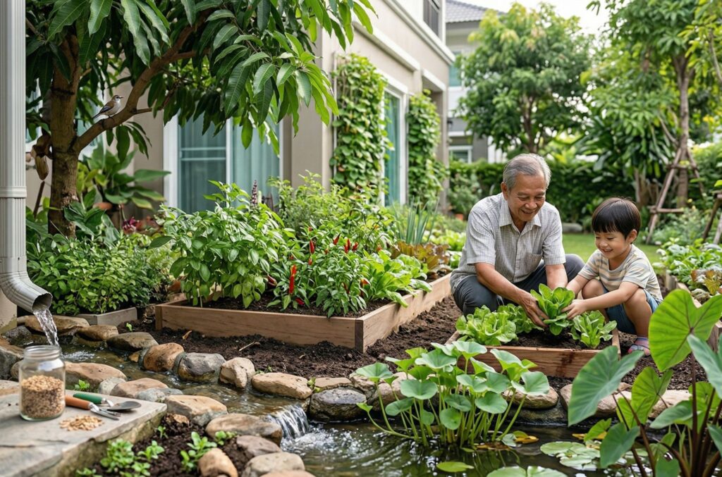 NbS ในระดับบ้าน ที่เห็นได้ชัด เช่น การปลูกต้นไม้รอบบ้านเพื่อช่วยลดอุณหภูมิและดักจับฝุ่น การทำสวนครัวหรือรั้วกินได้ เพื่อเพิ่มความมั่นคงทางอาหาร การทำพื้นที่ดินหรือบ่อเล็ก ๆ เพื่อให้น้ำฝนซึมลงดินแทนการไหลท่วมขัง หรือการปลูกพืชหลากหลายชนิดเพื่อช่วยฟื้นฟูดินและลดการใช้สารเคมี รวมถึงการใช้พืชน้ำในการบำบัดน้ำเสียเป็นการนำน้ำกลับมาใช้ใหม่และประหยัดการใช้น้ำ สิ่งเหล่านี้ล้วนเป็นการใช้ธรรมชาติช่วยแก้ปัญหา ทั้งเรื่องความร้อน อาหาร น้ำ และสิ่งแวดล้อม