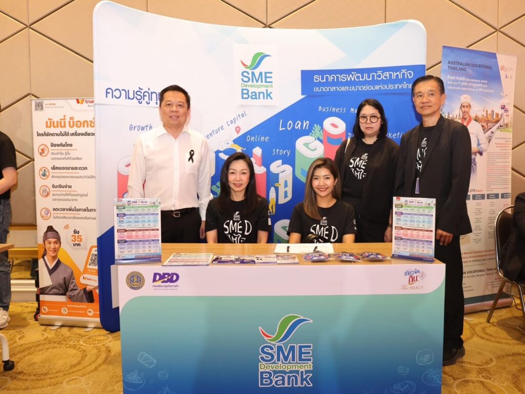 ทั้งนี้ SME D Bank พร้อมร่วมสนับสนุนผู้ประกอบการธุรกิจอาหารและเกี่ยวเนื่อง ไม่ว่าจะเป็นธุรกิจร้านอาหาร หรือผลิตภัณฑ์อาหารสำเร็จรูป หรือแปรรูปต่าง ๆ ยกระดับธุรกิจด้วยตราสัญลักษณ์ “Thai SELECT” ซึ่งจะทำให้ธุรกิจได้รับความสนใจและการันตีคุณภาพ ผ่านบริการ “พัฒนาคู่เติมทุน” ได้แก่ ด้านการเงินทุน ผ่าน 3 ผลิตภัณฑ์สินเชื่อดอกเบี้ยพิเศษ 3% ต่อปี คงที่ 3 ปีแรก ผ่อนนานสูงสุด 10 ปี นำไปลงทุน หรือเสริมสภาพคล่อง ต่อยอดธุรกิจ ได้แก่ “สินเชื่อปลุกพลัง SME” วงเงินไม่เกิน 1 ล้านบาท ไม่ต้องใช้หลักประกัน, “สินเชื่อ Beyond ติดปีก SME” และ “สินเชื่อ SME Green Productivity” วงเงินไม่เกิน 30 ล้านบาท ควบคู่กับช่วยพัฒนาครบวงจร แพลตฟอร์ม DX by SME D Bank (dx.smebank.co.th) ใช้งานสะดวกตลอด 24 ชั่วโมง และงานพัฒนาอื่นๆ ช่วยเสริมศักยภาพธุรกิจให้ยกระดับก้าวทันต่อการเปลี่ยนแปลงของผู้บริโภค รวมถึง ความต้องการของตลาด