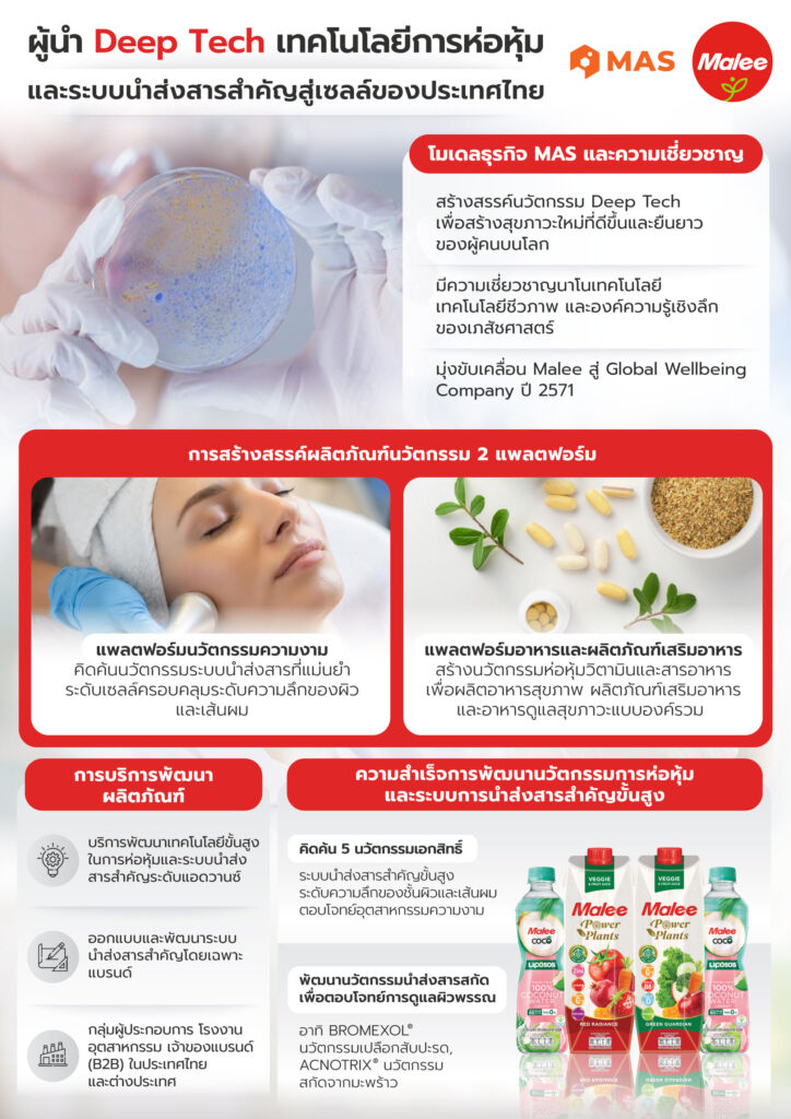 ในปี 2569 นี้ MAS ประสบความสำเร็จในการพัฒนาสินค้าวัตถุดิบที่มีเทคโนโลยีการนำส่งสารสำคัญเข้าสู่เซลล์สำหรับอุตสาหกรรมสกินแคร์ ความงามและของใช้ส่วนบุคคล ที่จำหน่ายในเชิงพาณิชย์แล้ว 12 รายการ และยังมีศักยภาพในการนำนวัตกรรมที่ใช้เทคโนโลยีขั้นสูงในการห่อหุ้มและระบบนำส่งสารสำคัญเข้าแข่งขันในตลาดโลก เพื่อรับกับโอกาสที่นาโนเทคโนโลยีและเทคโนโลยีชีวภาพในสินค้าวัตถุดิบ จะเข้าดิสรัปอุตสาหกรรมความงาม สุขภาพ และสุขภาวะแบบองค์รวมในโลกยุคใหม่ ซึ่งจะพลิกโฉมนวัตกรรมให้มีความแม่นยำตรงจุดในระดับเซลล์ รับเทรนด์ผู้บริโภคที่ให้ความสนใจกับการดูแลสุขภาวะแบบตรงจุด (Precision Wellness)