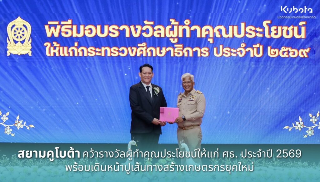 บริษัทสยามคูโบต้าคอร์ปอเรชั่น จำกัด เข้าร่วมรับมอบเข็ม “เสมาคุณูปการ” และประกาศเกียรติคุณบัตรแก่ผู้ทำคุณประโยชน์ให้แก่กระทรวงศึกษาธิการ ประจำปี 2569 เนื่องในวันคล้ายวันสถาปนากระทรวงศึกษาธิการ ครบรอบ 134 ปี โดยมีนายวิภู รักษ์นภาพงศ์ ผู้จัดการฝ่ายบริการลูกค้า เป็นผู้แทนรับมอบจากนายสุเทพ แก่งสันเทียะ ปลัดกระทรวงศึกษาธิการ ประธานในพิธี เพื่อเป็นการเชิดชูเกียรติและสร้างขวัญกำลังใจแก่ผู้บริหาร ครู และบุคลากรทางการศึกษา พร้อมทั้งเสริมสร้างความสามัคคีและความภาคภูมิใจในองค์กรในการร่วมกันขับเคลื่อนภารกิจด้านการศึกษาของประเทศ สะท้อนความมุ่งมั่นของสยามคูโบต้าในการปูเส้นทางสู่เกษตรกรยุคใหม่ภายใต้แนวคิด “KUBOTA Next Gen Farmer” ณ หอประชุมคุรุสภา
