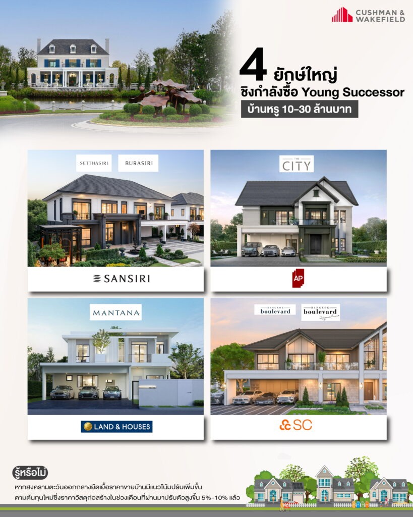 แม้กลุ่มที่อยู่อาศัยระดับราคา 10 ล้านบาทขึ้นไป จะครอบคลุมทั้งบ้านจัดสรรและคอนโดมิเนียม แต่ในเชิงโครงสร้างตลาดอสังหาฯ พบว่าสัดส่วนเกือบทั้งหมดเป็นสินค้าประเภทบ้านแนวราบ โดยมีคอนโดมิเนียมในระดับราคานี้อยู่ในตลาดจำนวนน้อย ทั้งนี้บ้านจัดสรรในช่วงราคา 10 – 30 ล้านบาท ถือเป็นเซกเมนต์หลักที่มีนัยสำคัญที่สุด โดยครองสัดส่วนสูงถึง 75% – 80% ของตลาดระดับบนทั้งหมด ส่งผลให้ผู้ประกอบการส่วนใหญ่เลือกให้น้ำหนักกับการพัฒนาโครงการในระดับราคานี้อย่างต่อเนื่อง เนื่องจากเป็นกลุ่มที่สามารถเข้าถึงฐานกำลังซื้อที่มีศักยภาพได้ในวงกว้างกว่ากลุ่มระดับอัลตราลักชัวรี โดยผู้ประกอบการแต่ละรายต่างมุ่งเน้นการสร้างจุดเด่นและกลยุทธ์ที่แตกต่างกันเพื่อสร้างความได้เปรียบในการแข่งขันและตอบโจทย์ความต้องการเฉพาะด้านของกลุ่มเป้าหมายนี้ได้อย่างมีประสิทธิภาพ โดยมีผู้เล่นหลักในตลาดที่น่าสนใจ ดังนี้