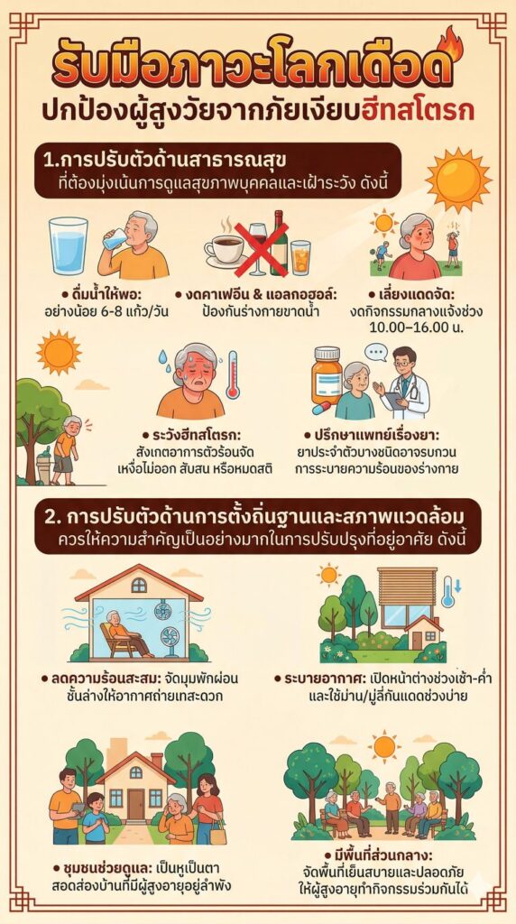 - หากผู้สูงอายุมีโรคประจำตัวที่ต้องรับประทานยา (บางชนิดอาจส่งผลต่อการขับเหงื่อและระบายความร้อน) ควรปรึกษาแพทย์เพิ่มเติม