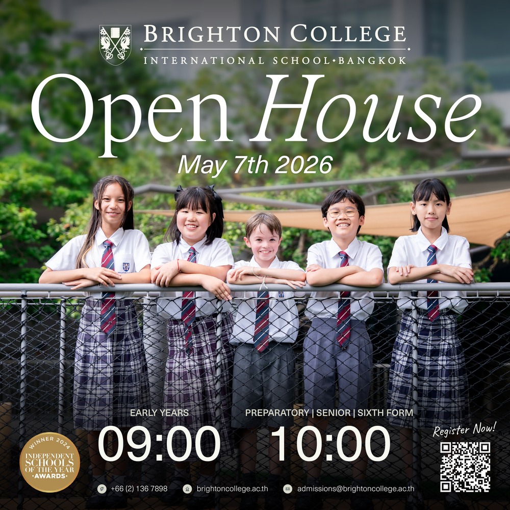 ขอเชิญผู้ปกครองเข้าร่วมงาน Open House ครั้งถัดไปของโรงเรียนนานาชาติไบรท์ตัน คอลเลจ กรุงเทพฯ ในวันที่ 7 พฤษภาคม 2569 สำหรับข้อมูลเพิ่มเติม กรุณาติดต่อ admissions@brightoncollege.ac.th