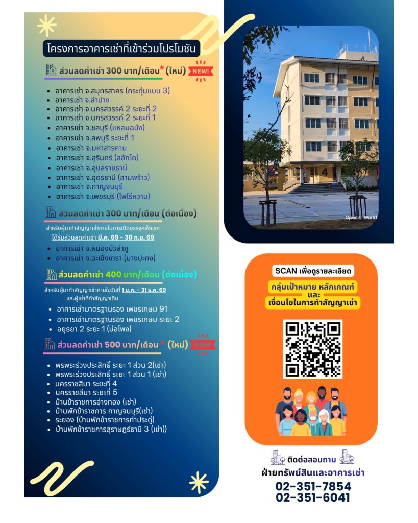 ส่วนโครงการที่ได้รับส่วนลด 400 บาทต่อเดือน ได้แก่ อาคารเช่ามาตรฐานรอง เพชรเกษม 91, เพชรเกษม ระยะที่ 2 และอยุธยา 2 ระยะที่ 1 (บ่อโพง) สำหรับผู้ที่ทำสัญญาเช่าภายในช่วงเดือนมกราคมถึงวันที่ 31 ธันวาคม 2569 ในส่วนโครงการที่ได้รับส่วนลดสูงสุด 500 บาทต่อเดือน ได้แก่ โครงการพรพระร่วงประสิทธิ์ ระยะที่ 1, นครราชสีมา ระยะที่ 4 และระยะที่ 5 รวมถึงบ้านพักข้าราชการในจังหวัดอ่างทอง, กาญจนบุรี, ระยอง และสุราษฎร์ธานี โดยผู้ที่ทำสัญญาเช่าในช่วงเดือนพฤษภาคมถึงวันที่ 31 กรกฎาคม 2569 จะได้รับสิทธิส่วนลดค่าเช่าจนถึงเดือนกันยายน 2569