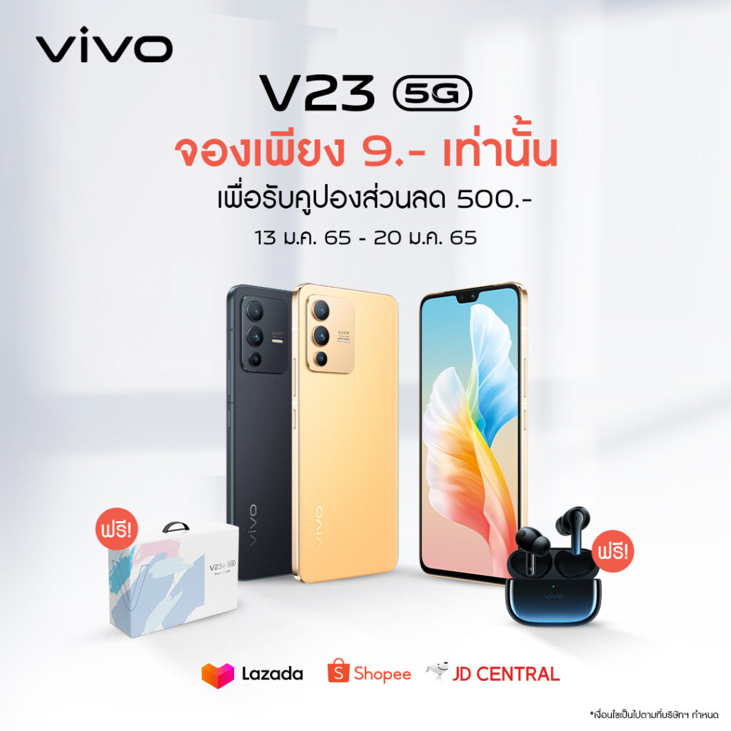 vivo แบรนด์สมาร์ตโฟนชั้นนำระดับโลก พร้อมส่งมอบสุดยอดสมาร์ตโฟน vivo V23 5G ให้ผู้ใช้งานชาวไทยเป็นเจ้าของได้ง่ายยิ่งขึ้น ในราคามัดจำเพียง 9 บาท พร้อมรับไปเลยส่วนลดค่าเครื่องมูลค่า 500 บาท จำกัดให้ 100 สิทธิ์เท่านั้น เมื่อสั่งซื้อผ่าน 3 แพลตฟอร์มช้อปปิ้งออนไลน์ ทั้ง Lazada, Shopee และ JD Central ตั้งแต่ วันนี้ – 20 มกราคม 2565 และพิเศษกว่าใครเมื่อสั่งจอง V23 5G ล่วงหน้า รับของสมนาคุณ Premium Gift มูลค่ารวมกว่า 10,497 บาท ไม่ว่าจะเป็น รับประกันตัวเครื่อง 2 ปี และรับประกันหน้าจอ 1 ครั้งภายใน 1 ปี (มูลค่า 6,999 บาท) หูฟังไร้สาย TWS 2e (มูลค่า 2,499 บาท) และ V23 Series Box set (มูลค่า 999 บาท) ฟรีทันที!