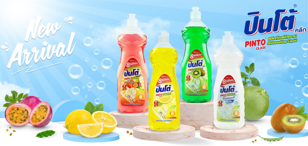 ล่าสุด น้ำยาล้างจานปินโต้ได้ออกผลิตภัณฑ์ใหม่ ภายใต้ชื่อ “ปินโต้คลิก” บรรจุในขวดเพชร สูตรใหม่ 8 in1 หรือ 8 Actions ที่สามารถขจัดกลิ่นคาว ขจัดคราบมัน ขจัดคราบอาหาร ไม่มีสารตกค้าง ใช้ล้างภาชนะพลาสติกได้ ไร้กลิ่นติดจาน ผสมน้ำมะนาวแท้ที่ให้วิตามินซี และได้กลิ่นหอมมะนาวระหว่างใช้งาน มีทั้งหมด 4 กลิ่นให้เลือกใช้ ได้แก่ กลิ่นมะนาว กลิ่นกีวี่ กลิ่นส้มโอและเสาวรส และสูตรอ่อนละมุน Pure & Care สูตรพรีเมียมที่อ่อนโยน ปลอดภัย ไร้สารเคมี สามารถใช้ทำความสะอาดภาชนะของเด็กได้อย่างไม่ต้องกังวลถึงสารตกค้าง และส่วนผสมผสมเข้มข้น ช่วยให้ขจัดคราบสกปรก คราบมัน กลิ่นคาวอาหาร ได้ในคลิกเดียว