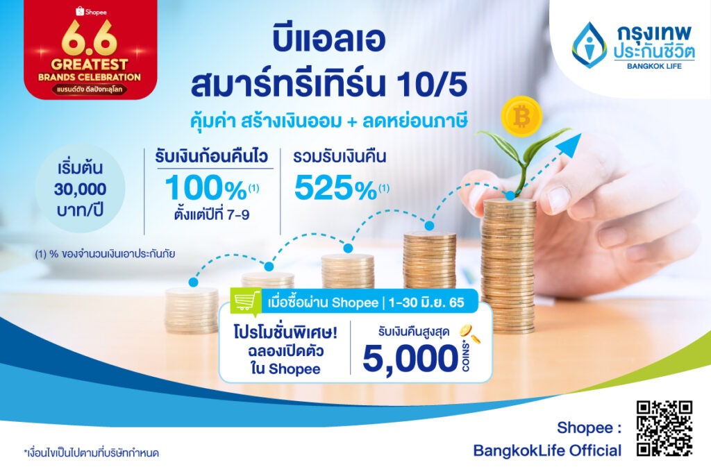 กรุงเทพประกันชีวิต ร่วมกับ ช้อปปี้ (Shopee) ผู้นำแพลตฟอร์มอีคอมเมิร์ซในภูมิภาคเอเชียตะวันออกเฉียงใต้และไต้หวัน ฉลองแคมเปญช้อปปิ้งสุดยิ่งใหญ่กลางปี Shopee 6.6 Greatest Brands Celebration เปิดตัวแบบประกันสะสมทรัพย์ใหม่ บีแอลเอ สมาร์ทรีเทิร์น 10/5 เอาใจวัยสมาร์ท ชูจุดเด่นได้เงินก้อนคืนไว พร้อมโปรดียืน 1 เอาใจนักช้อป เมื่อซื้อผ่านร้านออฟฟิเชียลสโตร์ “BangkokLife Official” บน Shopee Mall ตั้งแต่วันที่ 1 – 30 มิถุนายน 2565