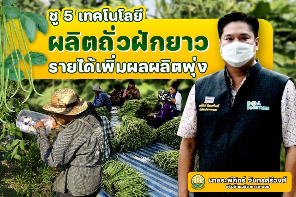 กรมวิชาการเกษตร ส่ง 5 เทคโนโลยีช่วยลดต้นทุน เพิ่มผลผลิตถั่วฝักยาวเมืองพิจิตร สร้างรายได้เพิ่มเกินคาด ผลผลิตเพิ่มเกือบเท่าตัวจากเดิมผลิตได้ 2,000 กิโลกรัม/ไร่ หลังใช้เทคโนโลยีสูงขึ้นถึง 3,850 กิโลกรัมต่อไร่ เกษตรกรวางแผนเตรียมเพิ่มมูลค่าผลผลิตยกระดับเข้ามาตรฐาน GAP