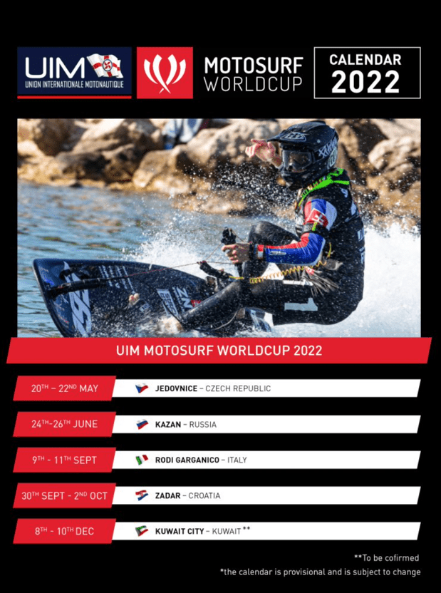 ในปี 2562 สมาพันธ์เรือเร็วโลก Union Internationale Motonautique  ( UIM ) ได้บรรจุกีฬา  MotoSurf  ให้เป็นกีฬาอีกชนิดหนึ่งในการแข่งขันกีฬาระดับโลก