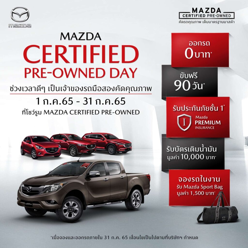 นอกจากจะมุ่งมั่นดูแลลูกค้ารายใหม่ที่กำลังจะเข้าสู่ครอบครัวมาสด้าแล้ว มาสด้ายังเอาใจใส่ดูแลลูกค้าเก่าอย่างใกล้ชิด เพื่อให้ลูกค้ามีทางเลือกที่ดีกว่า โดยลูกค้าที่ใช้รถยนต์มาสด้าอยู่แล้วสามารถนำรถมาเทรดอินกับรถใหม่ป้ายแดงหรือรถมือสองคุณภาพดี ที่ผ่านการรับรองมาตรฐานด้วยการตรวจสอบคุณภาพกว่า 119 จุด ภายใต้โครงการ MAZDA CERTIFIED PRE-OWNED กับแคมเปญ MAZDA CERTIFIED PRE-OWNED DAY ช่วงเวลาดีๆ เป็นเจ้าของรถมือสองคัดสรรคุณภาพที่ดีที่สุด มาพร้อมข้อเสนอออกรถเพียง 0 บาท*, ขับฟรี 90 วัน*, รับประกันภัยชั้น 1 Mazda Premium Insurance*, รับบัตรเติมน้ำมัน มูลค่า 10,000 บาท* และพิเศษจองรถในงานฯ รับ Mazda Sport Bag มูลค่า 1,500 บาท* ระหว่างวันที่ 1-31 ก.ค. 65 ที่โชว์รูม MAZDA CERTIFIED PRE-OWNED ทั่วประเทศ