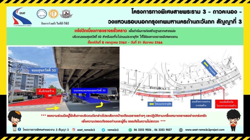 การทางพิเศษแห่งประเทศไทย (กทพ.) กระทรวงคมนาคมได้ว่าจ้าง กิจการร่วมค้า ไอทีดี-วีซีบี (ITD-VCB Joint Venture) ประกอบด้วย บริษัท อิตาเลียนไทย ดีเวล๊อปเมนต์ จำกัด (มหาชน) และบริษัท วิจิตรภัณฑ์ก่อสร้าง จำกัด เป็นผู้รับจ้างผู้ดําเนินการก่อสร้าง โครงการทางพิเศษสายพระราม3 – ดาวคะนอง – วงแหวนรอบนอกกรุงเทพมหานครด้านตะวันตกสัญญาที่ 3 จะดำเนินการปิดเบี่ยงการจราจรชั่วคราวบริเวณซอยสุขสวัสดิ์ 50 ตั้งแต่วันที่ 8 กรกฎาคม 2565 – วันที่ 31 ธันวาคม 2566 ตลอด 24 ชั่วโมง เพื่อดำเนินการก่อสร้างฐานรากเสาตอม่อของโครงการฯ สำหรับรถที่จะไปถนนประชาอุทิศให้ใช้ช่องจราจรพิเศษทดแทน