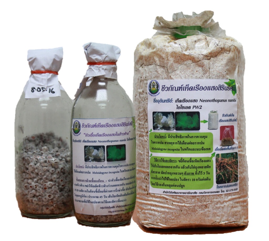 สำนักวิจัยพัฒนาการอารักขาพืช กรมวิชาการเกษตร ได้ศึกษาวิจัยหาวิธีการป้องกันกำจัดโรครากเน่าโคนเน่าโดยชีววิธี เพื่อลดการใช้สารเคมี โดยนำสารสกัดจากเห็ดเรืองแสงสิรินรัศมีผสมกับสีฝุ่น (iron oxide) นำไปทาเพียงครั้งเดียวบนแผลที่เป็นโรครากเน่าโคนเน่าพบว่าสามารถควบคุมโรคได้ประมาณ 1 ปีโดยที่แผลยังแห้ง ไม่มีน้ำเยิ้ม และเชื้อไม่ขยายลุกลาม ซึ่งแตกต่างจากวิธีที่เกษตรกรนิยมใช้ในปัจจุบันคือใช้สารเคมีเมทาแลกซิล 25% WP ที่ต้องทาซ้ำทุก 7 วัน จนกว่าแผลจะแห้ง ซึ่งคณะนักวิจัยได้ลงพื้นที่ทดสอบเทคโนโลยีการใช้เห็ดเรืองแสงสิรินรัศมีควบคุมโรครากเน่าและโคนเน่าสาเหตุจากเชื้อไฟทอปธอร่าในทุเรียนในเขตพื้นที่ อ.ไชยา จ.สุราษฎร์ธานี อ.กะปง จ.พังงา อ.ธารโต และ อ.บันนังสตา จ.ยะลา ตั้งแต่ปี 2563 – 2565 ผลปรากฏว่าวิธีการใช้เห็ดเรืองแสงสิรินรัศมีควบคุมโรครากเน่าโคนเน่าจากเชื้อไฟทอปธอร่าในทุเรียน เป็นที่ยอมรับของนักวิชาการและเกษตรกรในพื้นที่ดังกล่าว