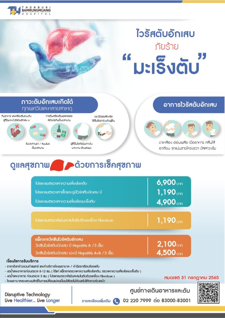 เนื่องในวันตับอักเสบโลก โรงพยาบาลธนบุรี บำรุงเมือง ขอเชิญชวนผู้ที่มีปัจจัยเสี่ยงต่อไวรัสตับอักเสบ รับการตรวจสุขภาพในแพ็กเกจ “ไวรัสตับอักเสบ ภัยร้ายมะเร็งตับ” เหมาะสำหรับผู้ที่มีปัจจัยเสี่ยงที่รับประทานอาหาร และเครื่องดื่มร่วมกับผู้ที่มีพาหะไวรัสตับอักเสบ A รับประทานยาหรือสมุนไพรเป็นเวลานาน ดื่มเครื่องดื่มแอลกอฮอล์ติดต่อเป็นเวลานาน ผู้ที่เป็นโรคไขมันเกาะตับเบาหวาน อ้วนลงพุง และมีประวัติรอยสักหรือใช้เข็มฉีดยาร่วมกับผู้อื่น เข้ารับการตรวจเช็คสุขภาพตับด้วย โปรแกรมตรวจหาความเสี่ยงโรคตับ ราคา 6,900 บาท โปรแกรมตรวจหาเชื้อและภูมิไวรัสตับอักเสบ บี ราคา 1,190 บาท โปรแกรมตรวจหาความเสี่ยงมะเร็งตับ ราคา 4,900 บาท โปรแกรมตรวจไขมันสะสมในตับด้วยเครื่อง Fibroscan 1,190 บาท