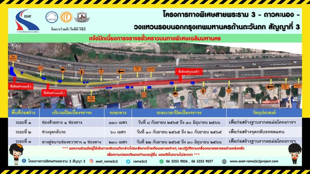 กทพ. ต้องขออภัยในความไม่สะดวกมา ณ โอกาสนี้ และขอความร่วมมือผู้ที่ใช้เส้นทางบริเวณดังกล่าวโปรดสังเกตป้ายเตือน สัญญาณจราจรต่าง ๆ และปฏิบัติตามเครื่องหมายจราจรอย่างเคร่งครัด เพื่อความปลอดภัยของผู้ใช้ทาง และขออภัยในความไม่สะดวกมา ณ โอกาสนี้หากมีข้อเสนอแนะ สามารถติดต่อสอบถามได้ที่ 02-405-4896 ตั้งแต่ 08.00-19.00 และ 062-912-6211 ตลอด 24 ชั่วโมง