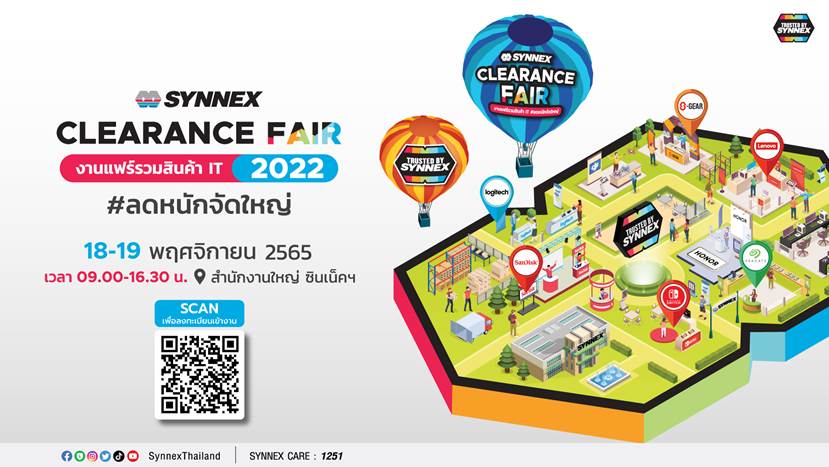 อีเว้นท์ส่งท้ายปีที่ไม่ควรพลาด!!! คงหนีไม่พ้นงาน “SYNNEX Clearance Fair 2022” จัดโดย บริษัท ซินเน็ค (ประเทศไทย) จำกัด (มหาชน) หรือ SYNEX ดิสทริบิวเตอร์ผู้นำด้านไอทีอีโคซิสเต็ม โดยมี นางสาวสุธิดา มงคลสุธี CEO เตรียมจัดงานแฟร์รวมสินค้าไอทีภายใต้สัญลักษณ์ Trusted by Synnex มาให้สาวกไอทีและเกมเมอร์ เลือกช้อปกันแบบลดหนักจัดใหญ่กับส่วนลดสูงสุดถึง 90% ไม่ว่าจะเป็นสินค้าสมาร์ทโฟน เดสก์ท้อป โน้ตบุ๊ก เกมมิ่งเกียร์ แกดเจ็ต และอุปกรณ์ไอทีหลากหลายชนิดรวมกว่าพันรายการ พร้อมโปรโมชันเด็ดๆ มากมายในงาน เรียกได้ว่าถ้าพลาดสินค้าในงานนี้ ต้องอดใจรอกันอีกทีปีหน้าเลยทีเดียว