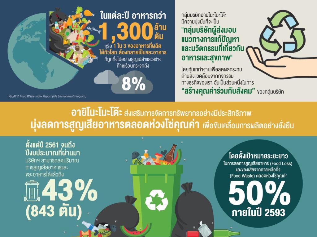 ข้อมูลจาก Food Waste Index Report ของโครงการสิ่งแวดล้อมแห่งสหประชาชาติ (UN Environment Program)เปิดเผยว่า ในแต่ละปี อาหารกว่า 1,300 ล้านตัน หรือ 1 ใน 3 ของอาหารที่ผลิตได้ทั่วโลก ต้องกลายเป็นขยะอาหารที่ถูกทิ้งไปอย่างสูญเปล่าและสร้างก๊าซเรือนกระจกถึง 8% ซึ่งอายิโนะโมะโต๊ะ ในฐานะบริษัทผู้ผลิตอาหารระดับโลก จึงมุ่งมั่นส่งเสริมกระบวนการผลิต การบริโภค และการดูแลสิ่งแวดล้อมอย่างยั่งยืนไปพร้อม ๆ กัน โดยบริหารจัดการทุกกิจกรรมทางธุรกิจเพื่อใช้ทรัพยากรให้เกิดประโยชน์อย่างสูงสุด มุ่งลดการสูญเสียอาหารตลอดห่วงโซ่คุณค่า ภายใต้แนวคิด “TOO GOOD, TOO WASTE” ซึ่งริ่เริ่มโดยกลุ่มบริษัทอายิโนะโมะโต๊ะ โดยตั้งแต่ปี 2561 จนถึงปีงบประมาณที่ผ่านมา อายิโนะโมะโต๊ะ ประเทศไทย สามารถลดปริมาณการสูญเสียอาหารและขยะอาหารได้แล้วถึง 43% (หรือ 843 ตัน) จากเป้าหมายที่ตั้งไว้ 50% ภายในปี 2568 และกำลังดำเนินการอย่างต่อเนื่องในปัจจุบัน ด้วยการดำเนินกิจกรรมที่หลากหลายเพื่อใช้ทรัพยากรให้คุ้มค่าสูงสุด อาทิ การบริหารจัดการกระบวนการผลิตโดยไม่ก่อให้มีของเสีย การจัดการห่วงโซ่อุปทาน (Supply Chain) ที่เหมาะสมโดยใช้ดิจิทัลเทคโนโลยีที่ทันสมัย การมุ่งลดของเสียในกระบวนการจัดจำหน่าย เป็นต้น