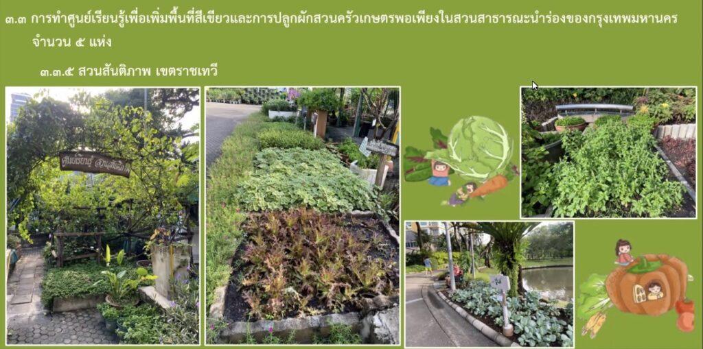 - การจัดตั้งศูนย์เรียนรู้เพื่อเพิ่มพื้นที่สีเขียว และการปลูกผักสวนครัวเกษตรพอเพียงในสวนสาธารณะนำร่อง 5 แห่ง ได้แก่ 1) สวนจตุจักร เขตจตุจักร มีการทำศูนย์เรียนรู้ปลูกพืชผักสวนครัว พืชสมุนไพร และเลี้ยงไก่ 2) สวนเฉลิมพระเกียรติ 6 รอบ พระชนมพรรษา (ฝั่งพระนคร) เขตบางคอแหลม มีการสนับสนุนเมล็ดพันธุ์ผัก และให้ความรู้ แก่ผู้ที่สนใจ 3) สวนรมณีย์ทุ่งสีกัน เขตดอนเมือง ศูนย์เรียนรู้ปลูกพืชผักสวนครัว 4) สวนสราญรมย์ เขตพระนคร เปิดเป็นศูนย์เรียนรู้และศึกษาดูงานแก่ประชาชนและผู้ที่สนใจ 5) สวนสันติภาพ เขตราชเทวี เป็นแหล่งเรียนรู้และเปิดรับแลกขยะรีไซเคิล