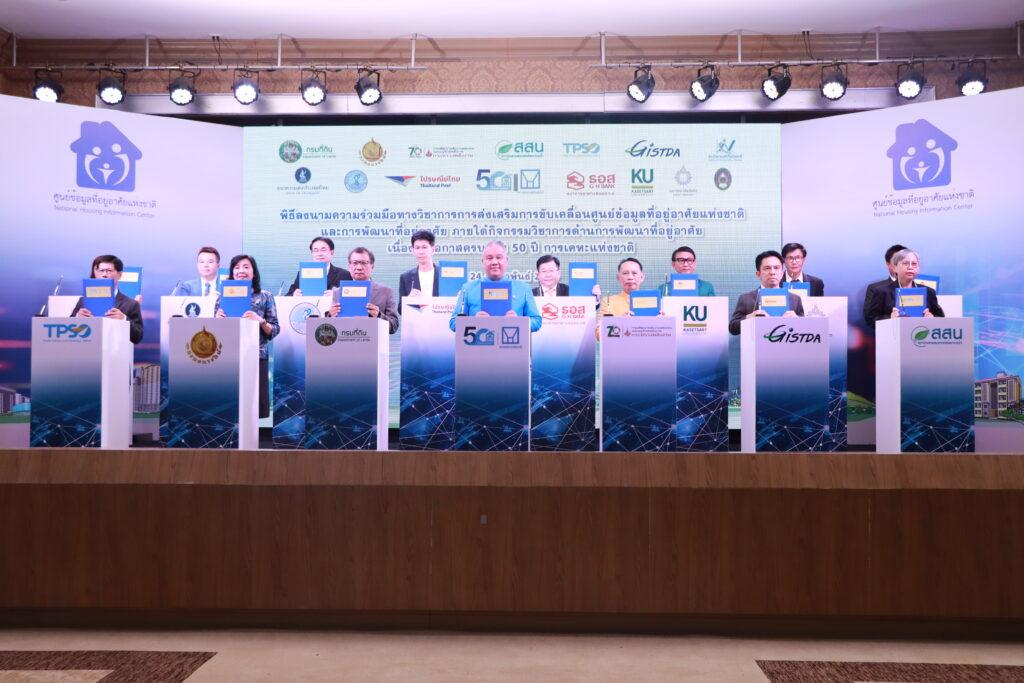 เมื่อวันที่ 24 กุมภาพันธ์ 2566 นายทวีพงษ์ วิชัยดิษฐ ผู้ว่าการการเคหะแห่งชาติ เป็นประธานในพิธีลงนามความร่วมมือทางวิชาการการส่งเสริมการขับเคลื่อนศูนย์ข้อมูลที่อยู่อาศัยแห่งชาติ และการพัฒนาที่อยู่อาศัย ภายใต้ “กิจกรรมวิชาการด้านการพัฒนาที่อยู่อาศัยเนื่องในโอกาสครบรอบ 50 ปี การเคหะแห่งชาติ” พร้อมลงนามความร่วมมือกับ 14 หน่วยงาน โดยมีผู้แทนหน่วยงานต่าง ๆ ร่วมลงนาม ได้แก่ นายชยาวุธ จันทร อธิบดีกรมที่ดิน ดร.ประเสริฐ สินสุขประเสริฐ อธิบดีกรมพัฒนาพลังงานทดแทนและอนุรักษ์พลังงาน นางบุษกร ปราบนศักดิ์ ที่ปรึกษาด้านพัฒนาการประเมินราคาอสังหาริมทรัพย์ กรมธนารักษ์ นายปกรณ์ อาภาพรรณ ผู้อำนวยการสำนักงานพัฒนาเทคโนโลยีอวกาศและภูมิสารสนเทศ ดร.กนกศรี ศรินนภากร นักวิจัยและรักษาการหัวหน้างานภูมิอากาศและสภาพอากาศ สถาบันสารสนเทศทรัพยากรน้ำ นายวิชานัน นิวาดจินดา รองผู้อำนวยการสำนักงานนโยบายและยุทธศาสตร์การค้า นางสาวสุวรรณี วังกานต์ รองผู้อำนวยการสำนักงานสถิติแห่งชาติ นายสุวัชชัย ใจข้อ ผู้อำนวยการฝ่ายบริหารข้อมูลและดาต้าอนาไลติกส์ ธนาคารแห่งประเทศไทย นายธำรง บูรณตระกูล รองผู้ว่าการด้านเทคโนโลยีดิจิทัล การประปานครหลวง นายนเรศ ไชยวงค์ ประธานเจ้าหน้าที่บริหารสายงานระบบไปรษณีย์และปฏิบัติการนครหลวง บริษัท ไปรษณีย์ไทย จำกัด นายวิชัย วิรักพันธุ์ รักษาการผู้อำนวยการศูนย์ข้อมูลอสังหาริมทรัพย์ธนาคารอาคารสงเคราะห์ ผศ.ดร.นิคม แหลมสัก รองอธิการบดีฝ่ายนวัตกรรมและกิจการเพื่อสังคม มหาวิทยาลัยเกษตรศาสตร์ ผศ.ดร.นฤพนธ์ ไชยยศ คณบดีคณะสถาปัตยกรรมศาสตร์ มหาวิทยาลัยรังสิต และ ผศ.จรายุทธ ประทีปวรกาญจน์ รองอธิการบดี มหาวิทยาลัยราชภัฏกาญจนบุรี พร้อมทั้งผู้บริหารจากหน่วยงานต่าง ๆ ผู้ปฏิบัติงานการเคหะแห่งชาติ และสื่อมวลชนร่วมเป็นสักขีพยาน ณ ห้องประชุมชั้น 3 อาคาร 5 (สันทนาการ) การเคหะแห่งชาติ