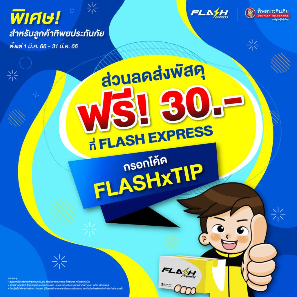ทิพยประกันภัย ร่วมกับ แฟลช เอ็กซ์เพรส มอบโปรโมชันสุดเอ็กซ์คลูซีฟให้กับลูกค้า โดยมอบส่วนลดประกันภัยสูงสุด 15% ให้แก่ลูกค้าแฟลช เอ็กซ์เพรส และมอบส่วนลดค่าส่งพัสดุฟรีมูลค่า 30 บาทให้แก่ลูกค้าทิพยประกันภัย ตั้งแต่วันที่ 1 – 31 มีนาคม 2566