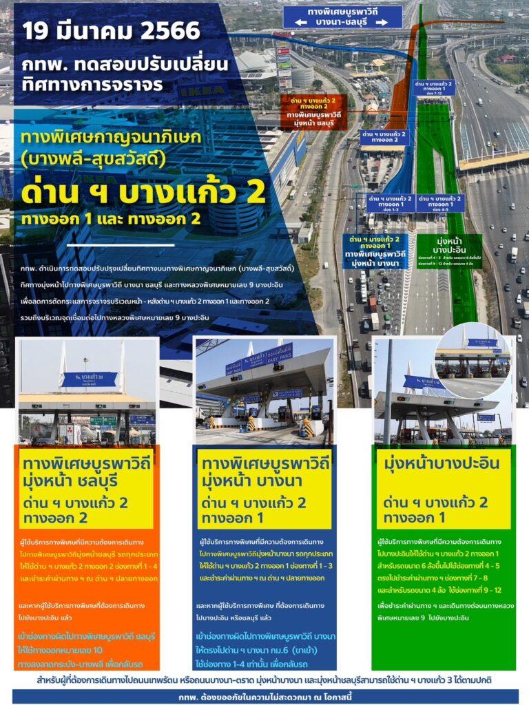การทางพิเศษแห่งประเทศไทย (กทพ.) กระทรวงคมนาคม จะดำเนินการทดสอบปรับเปลี่ยนทิศทางการจราจร และปรับปรุงระบบจัดเก็บค่าผ่านทางพิเศษช่องจราจรแบบ Pass Through บนทางพิเศษกาญจนาภิเษก (บางพลี-สุขสวัสดิ์) ทิศทางจากพระราม 2 มุ่งหน้าไปทางพิเศษบูรพาวิถี บางนา ชลบุรี และทางหลวงพิเศษหมายเลข 9 บางปะอิน เพื่อลดการตัดกระแสการจราจรบริเวณหน้า – หลัง ด่าน ฯ บางแก้ว 2 ทางออก 1 และทางออก 2 รวมถึงบริเวณจุดเชื่อมต่อไปทางหลวงพิเศษหมายเลข 9 บางปะอิน ตั้งแต่วันที่ 19 มีนาคม 2566 เวลา 00:01 น. เป็นต้นไป โดยมีรายละเอียดดังนี้