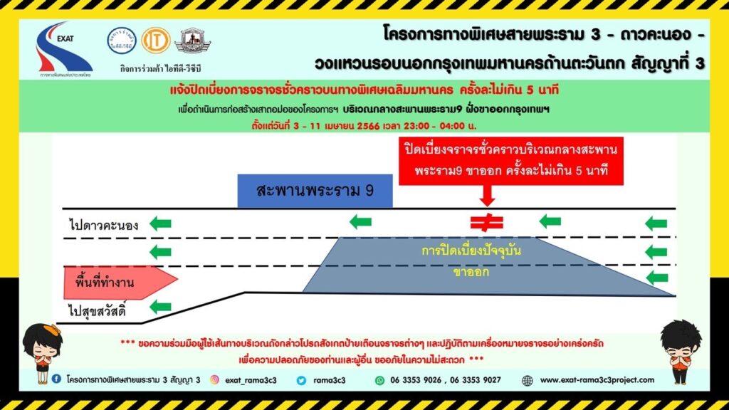 การทางพิเศษแห่งประเทศไทย (กทพ.) กระทรวงคมนาคมได้ว่าจ้าง กิจการร่วมค้า ไอทีดี-วีซีบี (ITD-VCB Joint Venture) ประกอบด้วย บริษัท อิตาเลียนไทย ดีเวล๊อปเมนต์ จำกัด (มหาชน) และบริษัท วิจิตรภัณฑ์ก่อสร้าง จำกัด เป็นผู้รับจ้างผู้ดําเนินการก่อสร้าง โครงการทางพิเศษสายพระราม3 – ดาวคะนอง – วงแหวนรอบนอกกรุงเทพมหานครด้านตะวันตกสัญญาที่ 3 แจ้งปิดเบี่ยงการจราจรชั่วคราวบนทางพิเศษเฉลิมมหานคร ครั้งละไม่เกิน 5 นาที เพื่อก่อสร้างฐานรากเสาตอม่อของโครงการฯ บริเวณกลางสะพานพระราม 9 ฝั่งขาออกกรุงเทพฯ ตั้งแต่วันที่ 3 – 11 เมษายน 2566 ตั้งแต่เวลา 23.00-04.00น.
