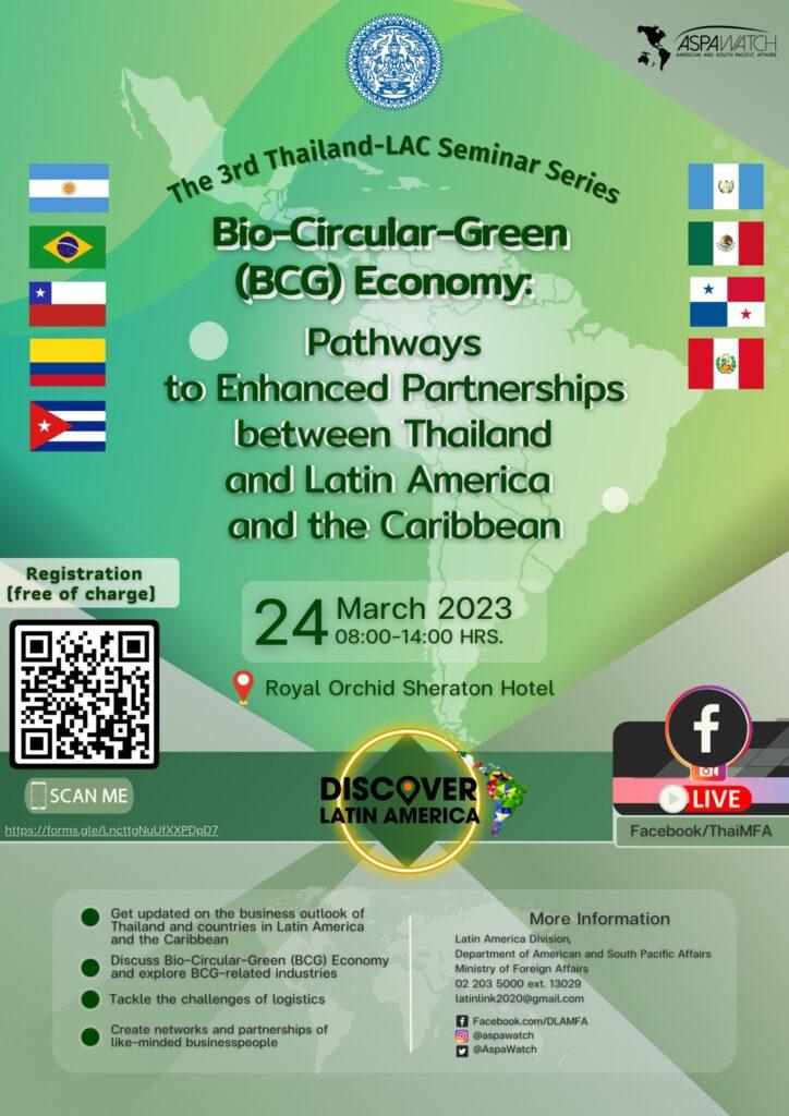 งานสัมมนาไทย-ลาตินอเมริกาและแคริบเบียน ครั้งที่ 3 จัดขึ้นโดยกระทรวงการต่างประเทศ กรมอเมริกาและแปซิฟิกใต้ ร่วมกับสถานเอกอัครราชทูตประเทศแถบลาตินอเมริกา 9 ประเทศ ได้แก่ อาร์เจนตินา บราซิล ชิลี โคลอมเบีย คิวบา กัวเตมาลา เม็กซิโก ปานามา และเปรู เพื่อร่วมหารือแนวทางความร่วมมือระหว่างประเทศไทยและประเทศในแถบลาตินอเมริกา รวมถึงแลกเปลี่ยนมุมมองนโยบายและมาตรการส่งเสริมการค้าการลงทุนด้านเศรษฐกิจ ซึ่งภูมิภาคลาตินอเมริกามีศักยภาพทางเศรษฐกิจสูง และมีนโยบายและแนวปฏิบัติที่ให้ความสำคัญกับสิ่งแวดล้อม สอดคล้องกับการพัฒนาเศรษฐกิจ BCG ของประเทศไทย