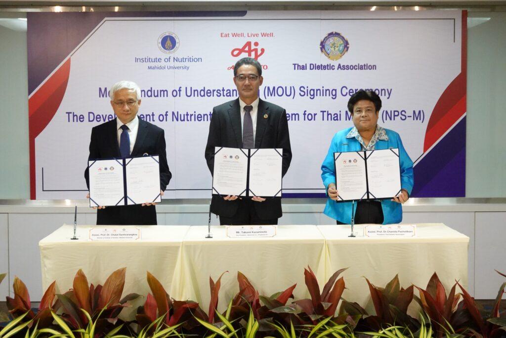เมื่อเร็วๆ นี้ มร.ทะกุมิ คะซะริโมะโตะ รองกรรมการผู้จัดการใหญ่ บริษัท อายิโนะโมะโต๊ะ (ประเทศไทย) จำกัด ร่วมกับ รศ.ดร.ชลัท ศานติวรางคณา ผู้อำนวยการสถาบันโภชนาการ มหาวิทยาลัยมหิดล และ ผศ.ดร.ชนิดา ปโชติการ นายกสมาคมนักกำหนดอาหารแห่งประเทศไทย ได้ร่วมลงนามบันทึกข้อตกลงความร่วมมือ (Memorandum of understanding: MOU) ในการร่วมพัฒนาระบบประเมินปริมาณสารอาหารสำหรับเมนูอาหารไทย (Nutrient Profiling System for Thai menus; NPS-M) เพื่อเป็นเครื่องมือในการส่งเสริมสุขภาพและโภชนาการที่ดีให้กับคนไทย ผ่านพฤติกรรมการบริโภคที่เหมาะสม โดยภายใต้ความร่วมมือนี้ ทุกภาคส่วนจะร่วมกันพัฒนาNPS-M รวมถึงจัดทำคำแนะนำสำรับอาหาร เพื่อให้คนไทยสามารถเลือกรับประทานอาหารที่ชอบ อร่อย และเหมาะสมกับสุขภาพของตนเองได้พร้อมๆ กัน ซึ่งพิธีลงนามจัดขึ้น ณ ห้องประชุมอารี วัลยะเสวี ชั้น 2 สถาบันโภชนาการ มหาวิทยาลัยมหิดล