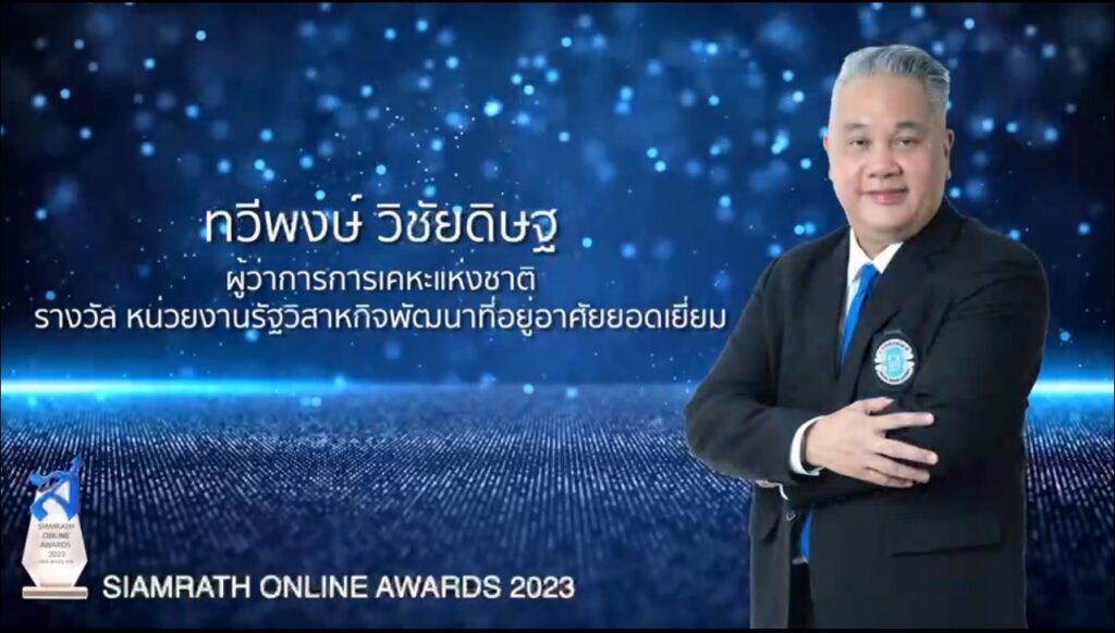 เมื่อวันที่ 27 เมษายน 2566 นายทวีพงษ์ วิชัยดิษฐ ผู้ว่าการการเคหะแห่งชาติ รับรางวัล “หน่วยงานรัฐวิสาหกิจพัฒนาที่อยู่อาศัยยอดเยี่ยม” ประจำปี 2566 ภายใต้งานประกาศรางวัล Siamrath Online Awards 2023 เนื่องในโอกาสครบรอบ 20 ปี สยามรัฐออนไลน์ ซึ่งจัดขึ้นเพื่อมอบรางวัลให้กับหน่วยงานภาครัฐ เอกชน และบุคคลในวงการบันเทิงที่มีผลงานเป็นที่ประจักษ์ และเป็นที่ยอมรับของประชาชน ณ ห้องแกรนด์ฮอลล์ อาคาร ทรู ดิจิทัล พาร์ค