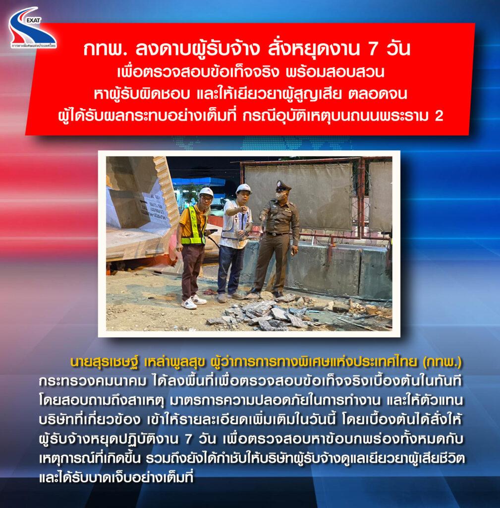 จากกรณี คานคอนกรีตสำเร็จรูป (Segment) จากการก่อสร้างโครงการทางพิเศษสายพระราม 3- ดาวคะนอง-วงแหวนรอบนอกกรุงเทพมหานครด้านตะวันตก สัญญาที่ 2 หล่นในขณะติดตั้ง บนถนนพระรามที่ 2 ทำให้มีผู้เสียชีวิต และได้รับบาดเจ็บ ตลอดจนมีรถของประชาชนได้รับความเสียหาย เหตุเกิดเมื่อวันที่ 7 พฤษภาคม 2566 เวลา 16.20 น. โดยประมาณ ซึ่งหลังเกิดเหตุ นายสุรเชษฐ์ เหล่าพูลสุข ผู้ว่าการการทางพิเศษแห่งประเทศไทย (กทพ.) กระทรวงคมนาคม ได้ลงพื้นที่เพื่อตรวจสอบข้อเท็จจริงเบื้องต้นในทันที โดยสอบถามถึงสาเหตุ มาตรการความปลอดภัยในการทำงาน และให้บริษัทที่ปรึกษาควบคุมงานและ ตัวแทนบริษัทที่เกี่ยวข้อง (กิจการร่วมค้า ซีทีบี ประกอบด้วย บริษัท ไชน่า ฮาร์เบอร์ เอ็นจิเนียริ่ง คัมปะนี ลิมิเต็ด บริษัท ทิพากร จำกัด และ บริษัท บุรีรัมย์ธงชัยก่อสร้าง จำกัด) เข้าให้รายละเอียดเพิ่มเติมในวันนี้ โดยเบื้องต้น ได้สั่งให้ผู้รับจ้างหยุดปฏิบัติงาน 7 วัน เพื่อหาสาเหตุจากอุบัติเหตุที่เกิดขึ้น รวมถึงยังได้กำชับให้มีการดูแลเยียวยาผู้เสียชีวิต และได้รับบาดเจ็บอย่างเต็มที่