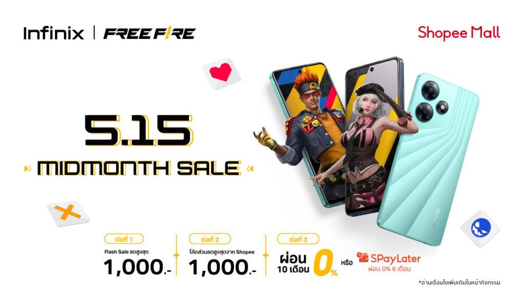 อินฟินิกซ์ (Infinix) แบรนด์สมาร์ตโฟนสายเกมราคาคุ้มค่า ครบครันทุกการใช้งาน และตอบโจทย์ไลฟ์สไตล์คนรุ่นใหม่ เดินหน้าจัดเต็มความคุ้มค่า มอบโปรโมชันลดแรงกลางเดือน เพื่อผู้ใช้งานและเหล่านักช้อปออนไลน์ ผ่านแคมเปญมาตามนัดทุกวันที่ 15 ของเดือนกับ Mid Month Sale ซึ่งนักช้อปจะได้พบกับมือถือหลายรุ่นยอดนิยม ที่มาพร้อมโปรดี ดีลโดนๆ ในช่วงเวลา Flash Sale ด้วยส่วนลดสูงสุด 1,000* บาท พร้อมรับข้อเสนอผ่อนสบาย 0% สูงสุดนาน 10 เดือน* เมื่อซื้อสินค้าที่ร่วมรายการ โดยสามารถซื้อสินค้าได้ที่ร้าน Infinix Official Store บน Shopee และ Lazada ในวันที่ 15 พฤษภาคม 2566 วันเดียวเท่านั้น!