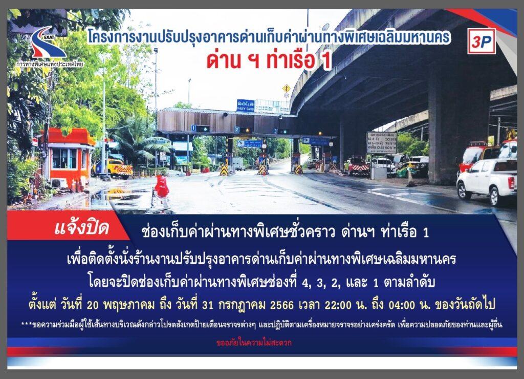 การทางพิเศษแห่งประเทศไทย (กทพ.) กระทรวงคมนาคม ได้ว่าจ้าง บริษัท เพียงพอ พร็อพเพอร์ตี้ จำกัด เป็นผู้รับจ้างดำเนินการก่อสร้างงานปรับปรุงอาคารด่านเก็บค่าผ่านทางพิเศษเฉลิมมหานคร จะดำเนินการติดตั้งนั่งร้าน โดยจะปิดด่านเก็บค่าผ่านทางพิเศษท่าเรือ 1 ช่องที่ 4, 3, 2, และ 1 ของด่าตามลำดับ ตั้งแต่วันที่ 20 พฤษภาคม ถึง 31 กรกฎาคม 2566 ช่วงเวลา 22.00 น. ถึง 04.00 น. ของวันถัดไป