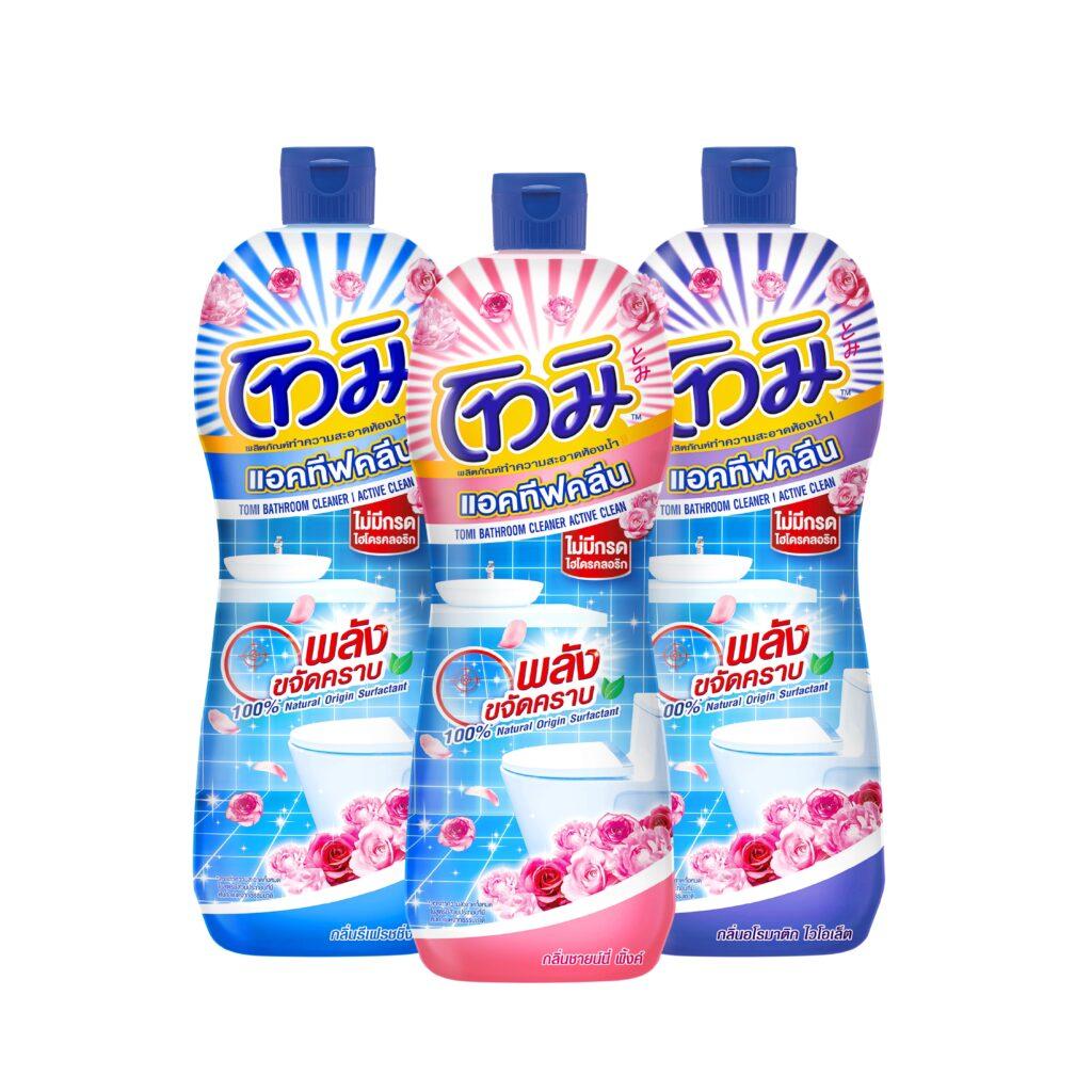 โทมิ ผลิตภัณฑ์ทำความสะอาดห้องน้ำ แอคทีฟคลีน สูตรไร้กรดไฮโดรคลอริก มือปราบคราบสกปรกที่จะช่วยให้การล้างห้องน้ำเป็นเรื่องง่ายดาย หมดปัญหาเคืองตาแสบจมูก ไร้กลิ่นฉุนขณะล้างทำความสะอาด เพราะปราศจากส่วนผสมของกรดไฮโดรคลอริก ที่เป็นอันตรายต่อระบบทางเดินหายใจ มาพร้อมประสิทธิภาพในการขจัดคราบสกปรกได้หลากหลายพื้นผิวในห้องน้ำ โดยไม่กัดกร่อน ไม่ทำลายพื้นผิว ร่องกระเบื้อง และสุขภัณฑ์ ให้กลิ่นหอม ไม่ฉุน อ่อนโยนด้วย 100% Natural Origin Surfactant มีผลทดสอบการระคายเคือง หมดปัญหากลิ่นไม่พึงประสงค์ มี 3 สี 3 กลิ่น ให้เลือกใช้ตามความชื่นชอบ ได้แก่ ชายน์นี่พิ้งค์ (สีชมพู),  อโรมาติก ไวโอเล็ต (สีม่วง) และ รีเฟรชชิ่ง บลู (สีฟ้า) ขนาด 700 มล.  ราคา 60 บาท