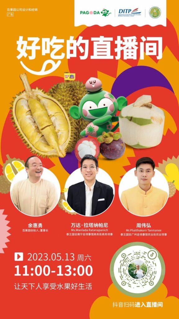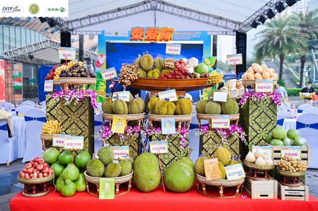 นอกจากนี้ฝ่ายเกษตร ประจำสถานกงสุลใหญ่ ณ นครกว่างโจว ร่วมกับสำนักงานส่งเสริมการค้าในต่างประเทศ ณ เมืองหนานหนิง และบริษัท เสิ่นเจอ้นปาโกดา อินดีสตรี(Shenzhen Pagoda Industrial (Group) Co., Ltd. )ซึ่งเป็นบริษัทผู้ค้าปลีกผลไม้รายใหญ่อันดับหนึ่งในประเทศจีน โดยปัจจุบันมีร้านค้าปลีกผลไม้ ภายใต้แบรนด์ Pagoda มากกว่า 5,645 สาขาทั่วประเทศจีน จัดงานเทศกาลผลไม้ไทย ประจำปี 2566 (Thai Fruit Festival 2023) ณ ห้างสรรพสินค้า Hangyang City นครหนานหนิง ภายใต้ธีม “泰爱你” (ไทยรักคุณ) ระหว่างวันที่ 11 – 17 พฤษภาคม 2566 เพื่อประชาสัมพันธ์และส่งเสริมการตลาดผลไม้ไทยทั้งในแพลตฟอร์มออนไลน์และออฟไลน์
